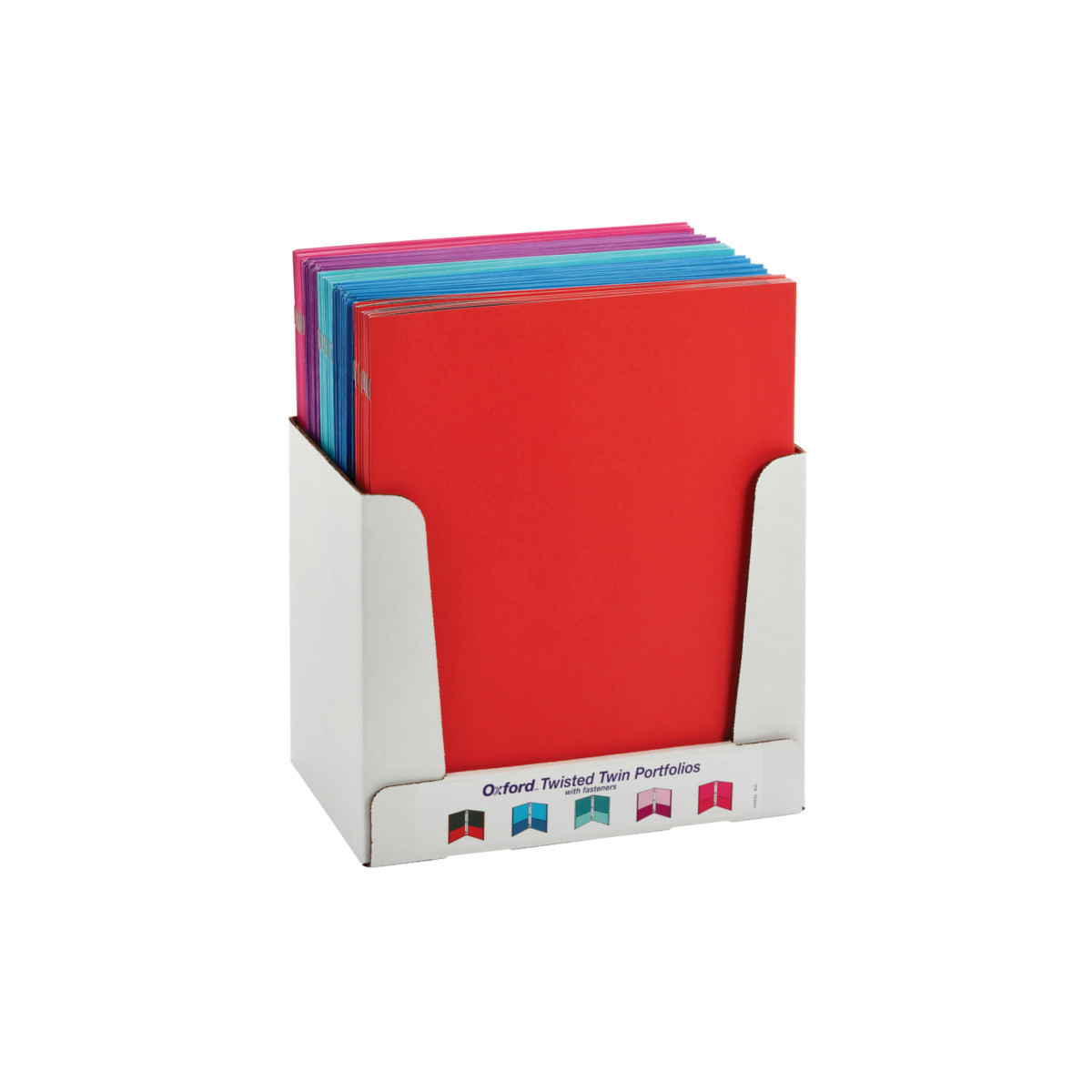 Twin pocket folder with fasteners hold 135 sheets of letter size paper (85 in fasteners; 25 per pocket), Leatherette embossed paper, Die-cut business card holder on inside pocket, Assorted colors, Contains 10% recycled fiber with 10% post consumer fiber.