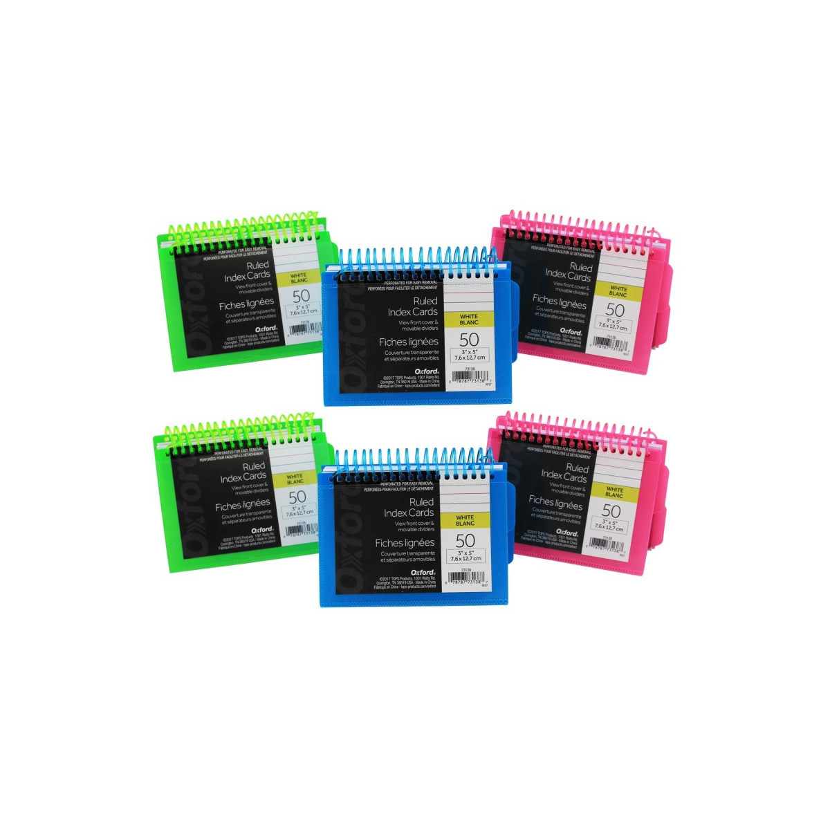 Oxford® Index Cards are ruled on one side for easy note taking. The 3" x 5" size is versatile enough for studying, presenting, and list-making. The handy spiral design keeps all your notes self-contained for easy reference. Each card has a perforated edge for easy removal of cards. There are 50 index cards per book, cover color may vary. Features clear view front sleeve for personalization or schedules! Includes two adjustable section tabs which can be labeled for instant referencing - simply snap in and out. Made of sturdy white card stock and ruled on one side. Assorted colors: Blue, Smoke, Green, Magenta. Please allow us to select your color for you. Each spiral bound pack includes 50 cards. Sold as 6 packs for a total of 300 cards.
