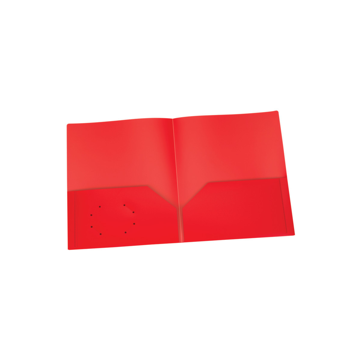 Colorful, flexible and durable for multiple uses. Lightweight poly resists wear and tear to help keep your work safe. Twin-pocket folders hold up to 50 sheets in each pocket. Interior die-cut business card holder keeps contact info close at hand. Letter size; Red; 25 per box.