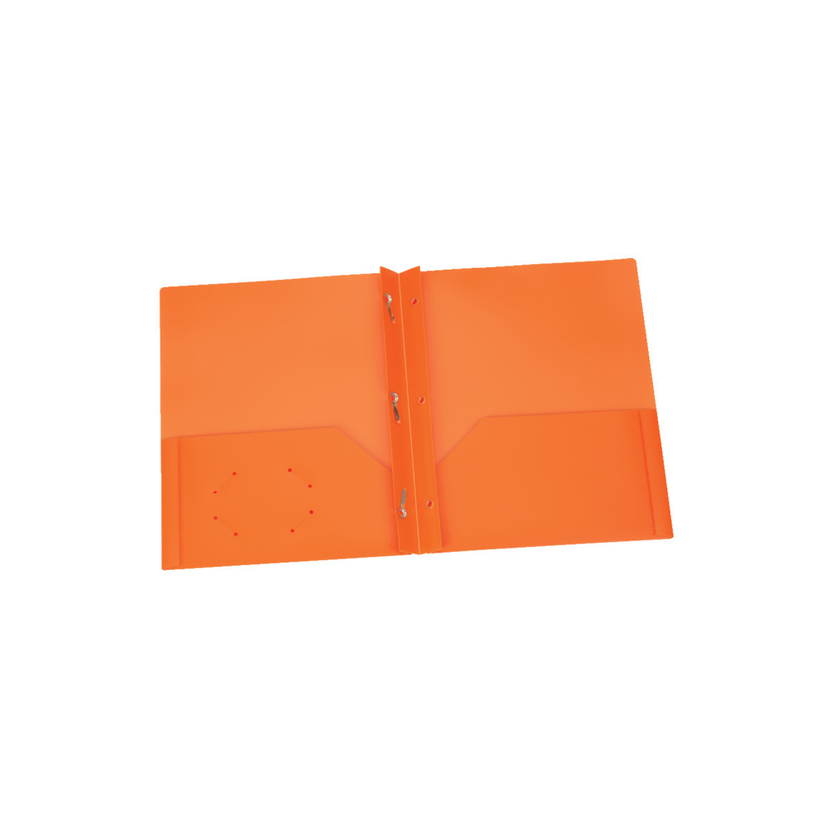 Colorful, flexible and durable for multiple uses. Lightweight poly resists wear and tear to help keep your work safe. Built-in, 2-prong fasteners hold up to 35 letter-sized 3-hole punched sheets. Twin-pocket folders hold up to 50 sheets in each pocket. Interior die-cut business card holder keeps contact info close at hand. Orange; 25 per box.