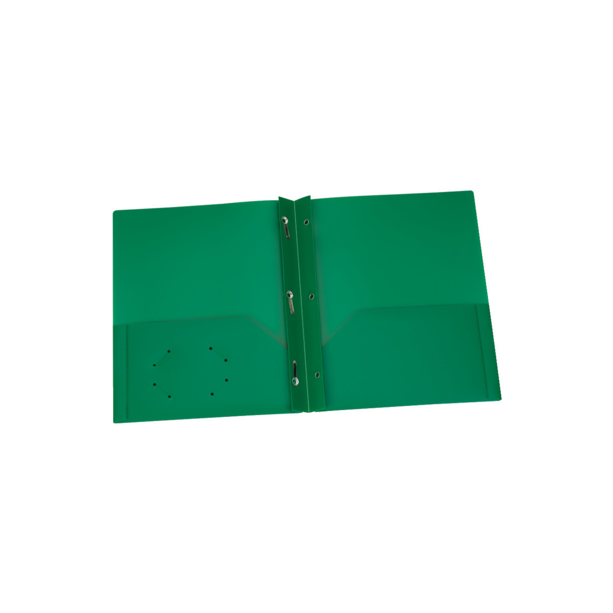 Colorful, flexible and durable for multiple uses. Lightweight poly resists wear and tear to help keep your work safe. Built-in, 2-prong fasteners hold up to 35 letter-sized 3-hole punched sheets. Twin-pocket folders hold up to 50 sheets in each pocket. Interior die-cut business card holder keeps contact info close at hand. Green; 25 per box.