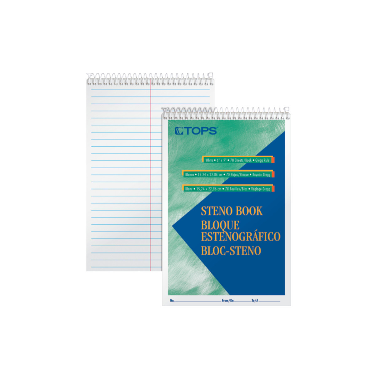 TOPS™ Steno Books are reliable top-bound notebooks ideal for home, school or office. The classic flip-top format gives quick access to notes and lists. The 6" x 9" size tucks easily into any backpack or bag. Perforated sheets detach easily. A sturdy, no-snag coil resists catching on papers or clothing. Proudly made in the USA. Gregg ruled, 80 sheets.