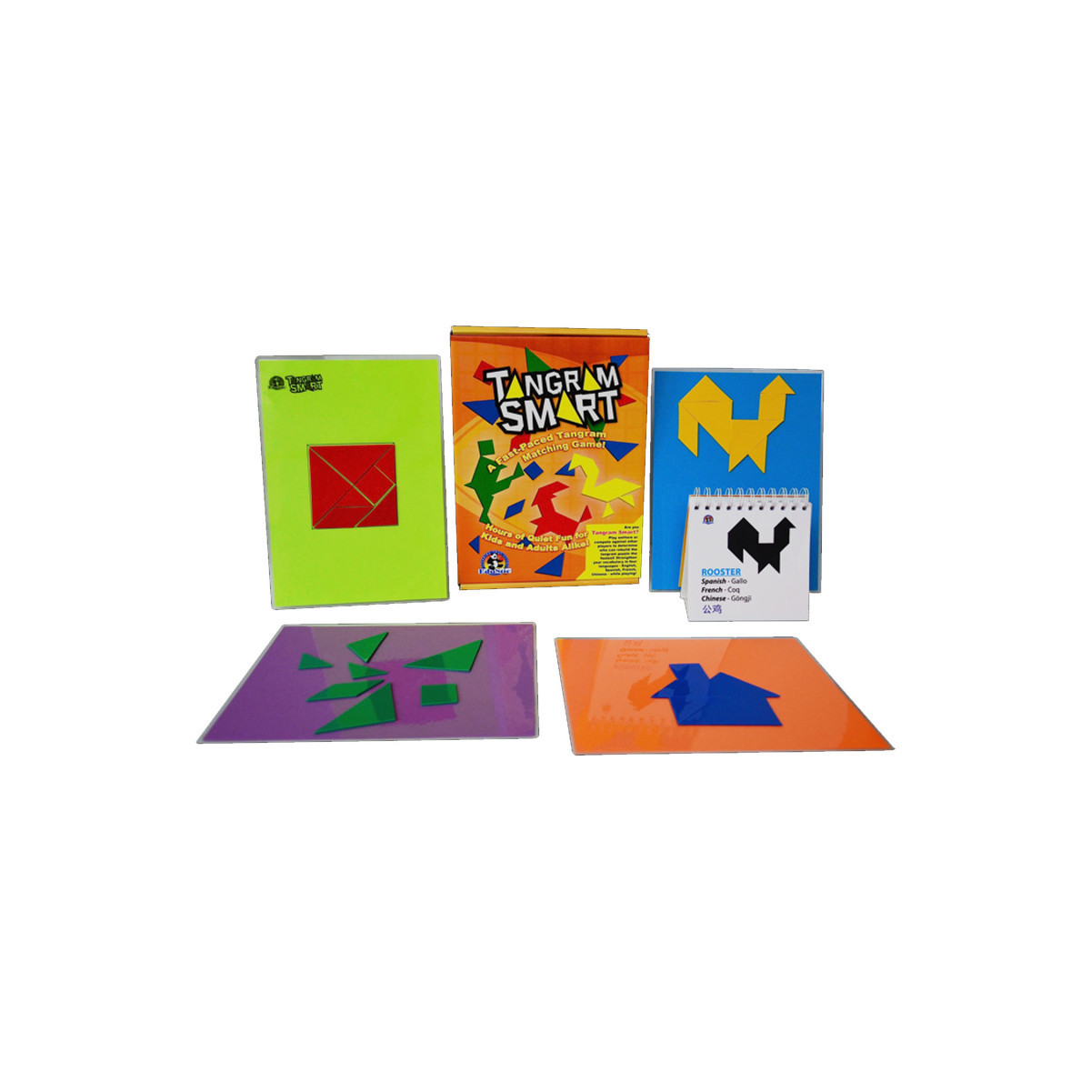 Tangram Smart is a fast-paced tangram-matching game that makes solving this cheerfully challenging centuries-old puzzler a joy. Fit colorful triangles, parallelograms and squares together to form hundred of shapes: traditional to whimsical, simple to complex. Animals, letter numbers, people and everyday objects are just some of the things you will find in out 45-object flipchart booklet. Puzzle fun and plane geometry are fearlessly forthright in this ancient Chinese game of congruence, similarity, and transformations. With English, Spanish, French and Chinese terms provided for each object, Tangram Smart is a game that will collect no dust, and is great for everyone! Our updated Tangram Smart Kit with CD includes 200+ pages of worksheets, lessons, activities, and more! For 1-4 players ages 5 and up. Play time: 15-30 minutes. Contents: 45-Object Flipchart Booklet, 4 Laminated Storage Sheets & Playboards, 4 EduStic Tangram Sets, and Parent and Teacher Handbook.