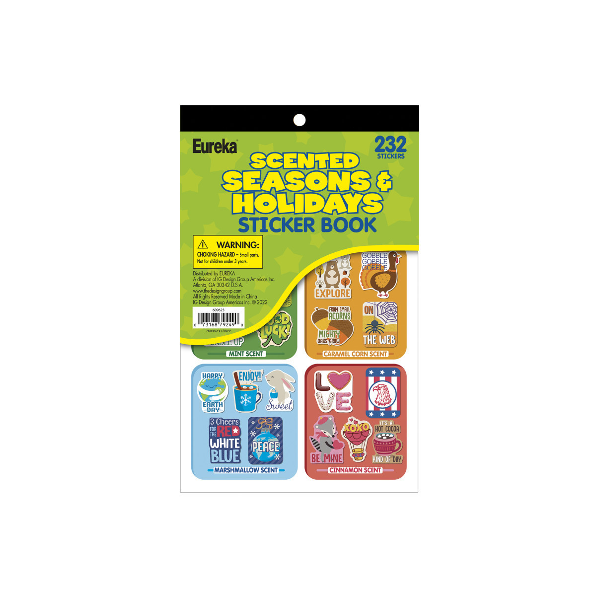 Easily provide classroom incentives all school year with Eureka Sticker Books! Sticker book includes 232 scented stickers in the following scents: Mint, Caramel Corn, Marshmallow, and Cinnamon! Includes sticker designs for seasons and holidays that take place throughout the year, all in one convenient sticker book! Stickerbook includes 8 pages. Each sticker page measures 5-3/4" x 9-3/8".