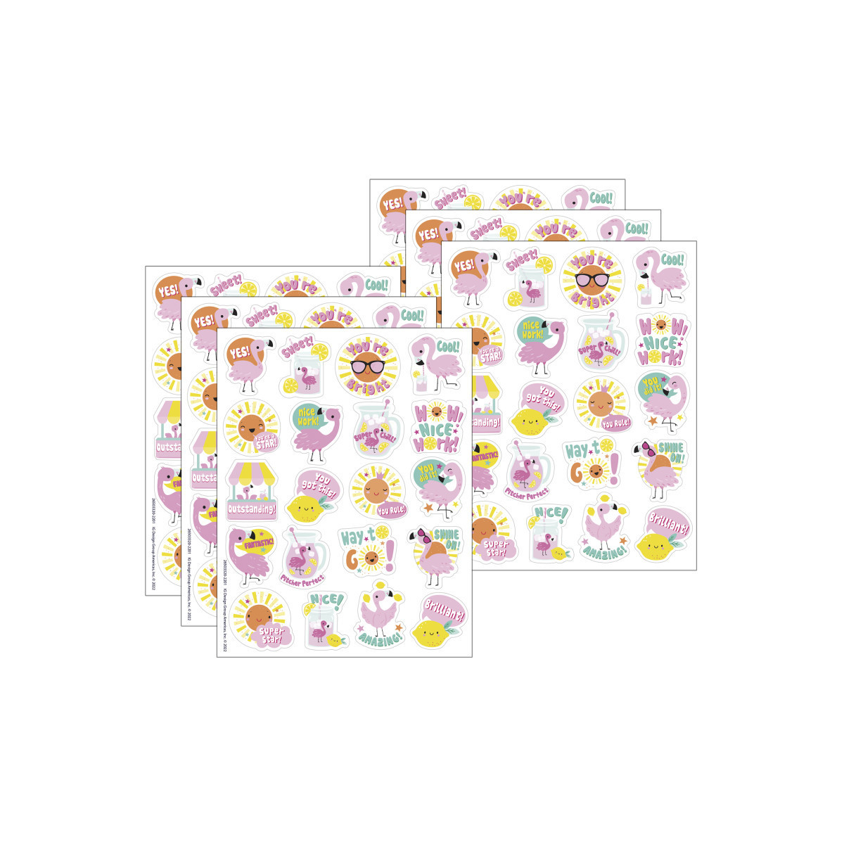 Kids will go crazy over this flock! These fun and colorful strawberry lemonade scented stickers are sure to be a favorite among students, teachers, and parents! Features fun sticker poses of ultra cool flamingos, each with a long-lasting smell. Add to graded assignments, classroom crafts, letters, party invites, cards, rewards, and more! Each sticker measures about 1" in diameter. Individual sticker size varies slightly by design. Each pack includes 80 scented self-adhesive stickers. Sold as 6 packs for a total of 480 stickers.