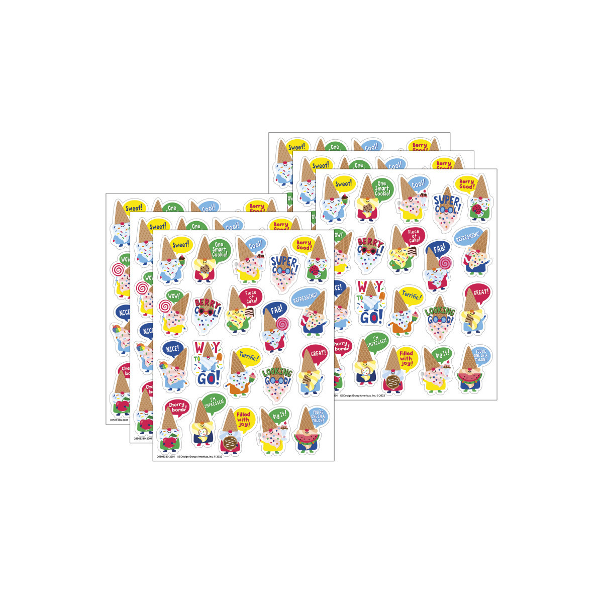 There's gnome doubt about it - everyone loves dessert! These fun and colorful candy scented stickers are sure to be a favorite among students, teachers, and parents! Features fun sticker poses of ultra cool gnomes, each with a long-lasting smell. Add to graded assignments, classroom crafts, letters, party invites, cards, rewards, and more! Each sticker measures about 1" in diameter. Individual sticker size varies slightly by design. Each pack includes 80 scented self-adhesive stickers. Sold as 6 packs for a total of 480 stickers.