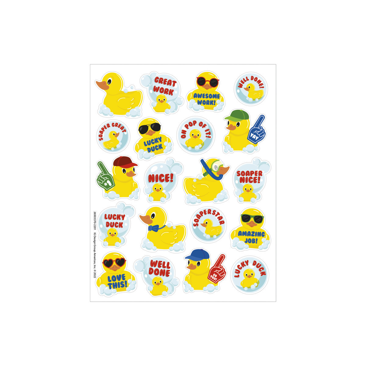 Quack students and children up with these pun-filled rubber duckies! These fun and colorful scented stickers feature adorable rubber duckies in a long-lasting bubble bath scent! Sure to be a favorite among students, teachers, and parents! Add to graded assignments, classroom crafts, letters, party invites, cards, rewards, and more! Each sticker measures about 1" in diameter. Individual sticker size varies slightly by design. Each pack includes 80 scented self-adhesive stickers.