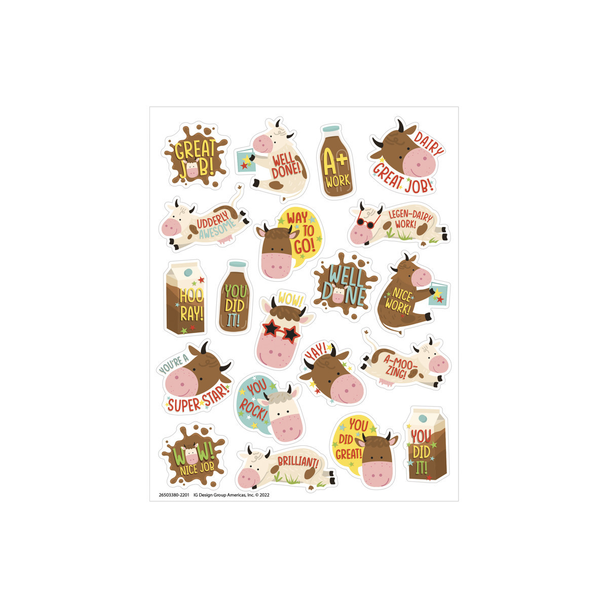 Reward students and children with these udderly adorable chocolate milk scented stickers, featuring adorable brown cows in a long-lasting scent! Sure to be a favorite among students, teachers, and parents! Add to graded assignments, classroom crafts, letters, party invites, cards, rewards, and more! Each sticker measures about 1" in diameter. Individual sticker size varies slightly by design. Each pack includes 80 scented self-adhesive stickers.