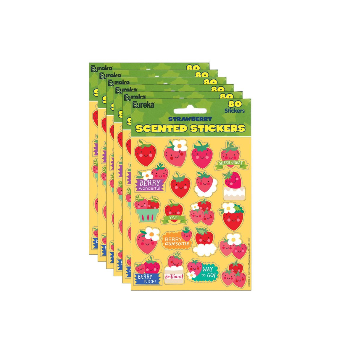 The choices are endless with Eureka stickers. There are hundreds of ways to utilize this versatile format at home or in the classroom. Each sticker measures about 1" in diameter. Each package contains 80 self-adhesive scented stickers per package. Sold as 6 packs for a total of 480 stickers.