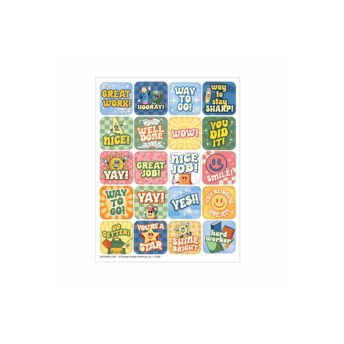 Motivate students to do their best by adding Eureka Theme Stickers to assignments, notes, charts are more! Individual sticker measures 1" x 1". Bring the cool to school with the S'Cool Era Collection! Products feature a fun mix of motivational phrases, trendy checkered prints, and retro school icons! Each pack includes 120 self-adhesive stickers.
