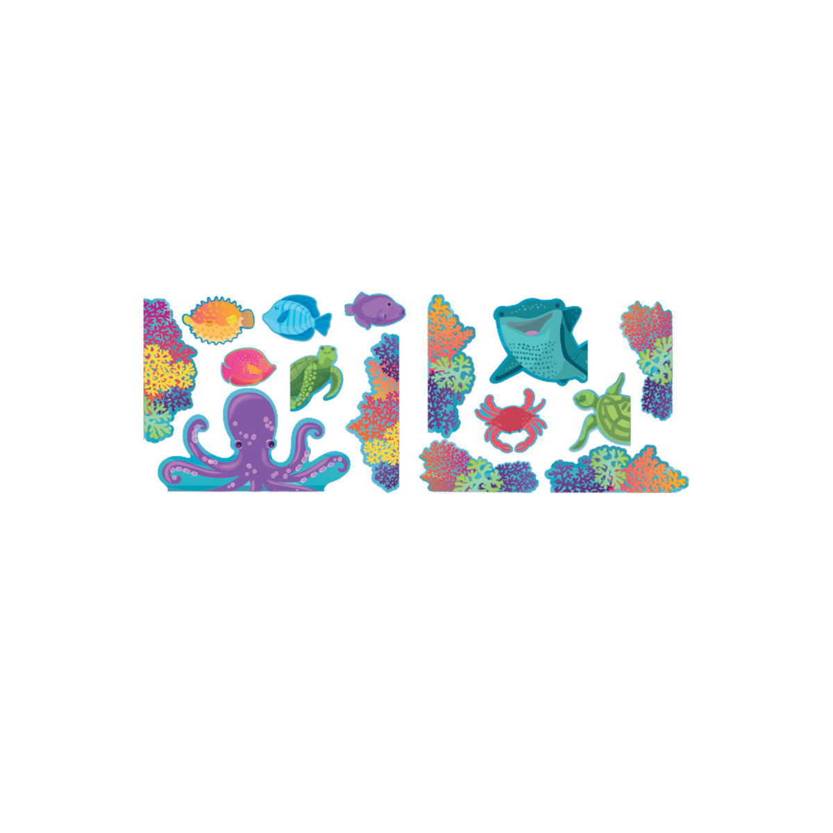 Eureka Go-Arounds® are a fun way to decorate around doors, windows, chalkboards, bulletin boards, archways and more. Each set features multiple pieces designed with a flat edge on one side allowing the characters to appear as if they are peeking out of the display. Make a splash! Make your classroom turtley awesome with the Seas the Day collection. Cool ocean vibes, motivational phrases, marine life imagery, and vibrant colors make this theme easy to age up or down. All pieces are printed on heavy weight cardstock and are reusable. Each set includes 15 pieces: 9 pieces of marine life and 6 pieces of coral.