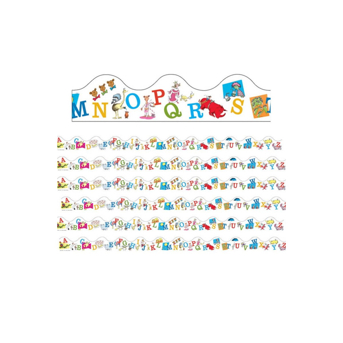 Use Deco Trim® as a finishing touch on the edges of your bulletin boards, windows, doorways, chalkboards and dry erase boards. Dr. Seuss characters line this ABC's bulletin board border, which is great for reinforcing the alphabet. The vibrant colors and designs will add creativity to all of your displays. Each pack includes 12 strips, each measures 2.25" W x 37" L. Sold as 6 packs for 222 feet (72 strips) total.