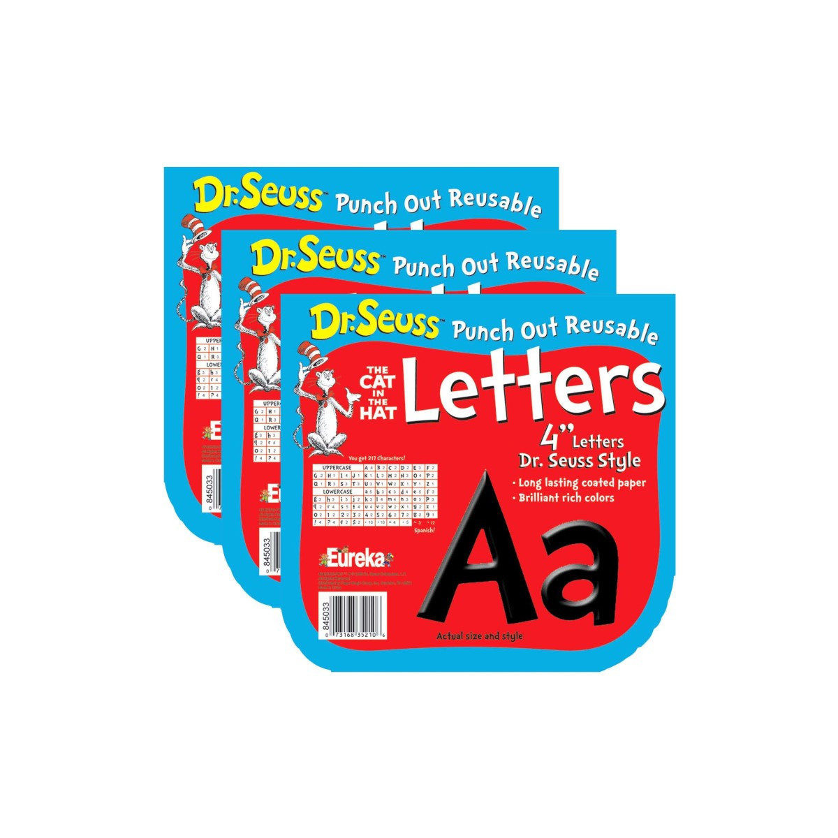 Try Eureka Reusable Punch Out Letters. Printed on coated paper with brilliant rich color, they are perfect for creating personalized projects in displays. Each punch-out, reusable letter measures 4", printed on long-lasting coated paper. Each pack contains 217 characters. Sold as 3 packs for 651 characters total.