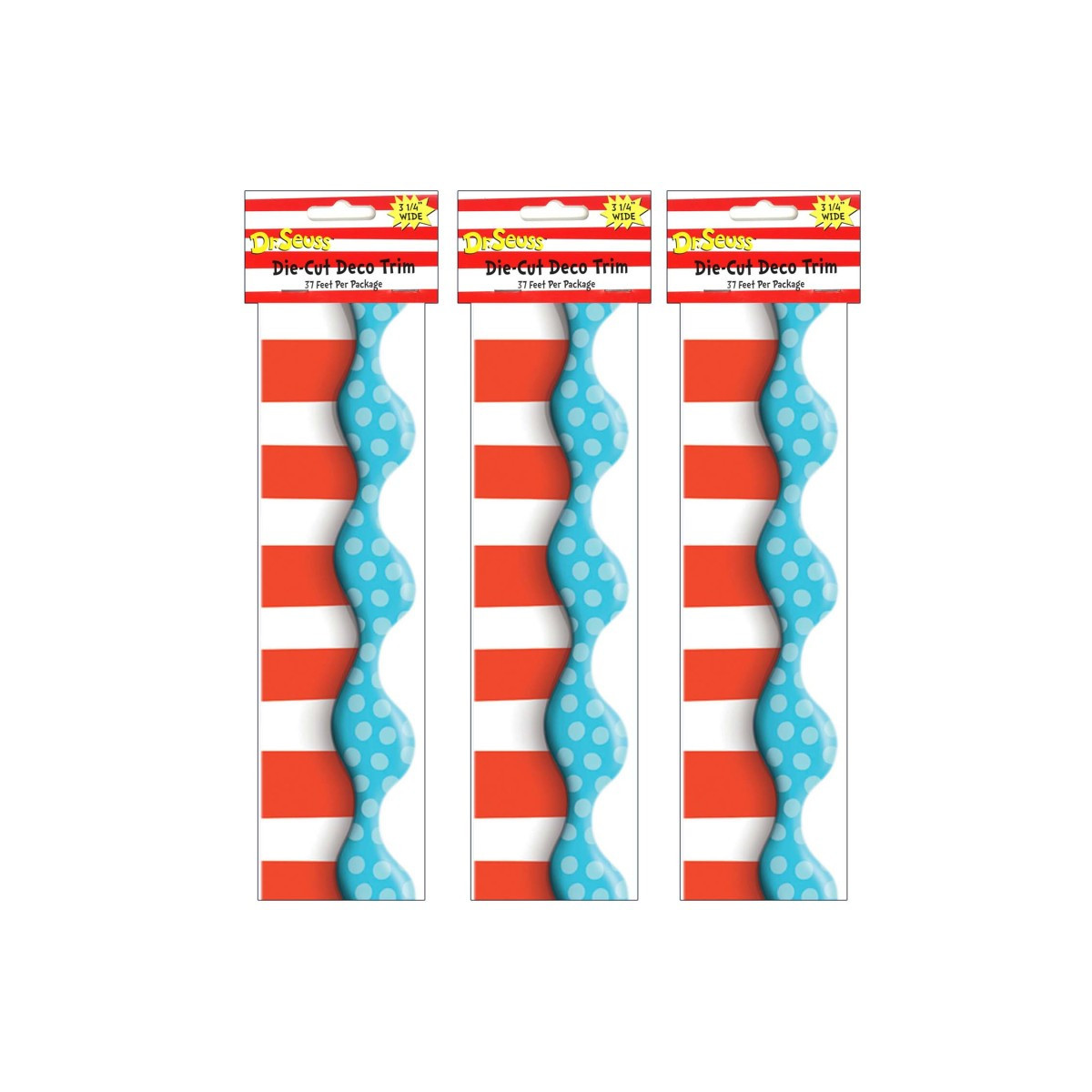 Use Extra Wide Die-Cut Deco Trim® as a finishing touch on the edges of your bulletin boards, windows, doorways, chalkboards and dry erase boards. This Dr. Seuss bulletin board border goes perfectly with circus themed classrooms. The vibrant colors and designs will add creativity to all of your classroom displays. Each strip measures 37"L x 3.25"W. Each pack contains 12 strips, for a total of 37 feet. Sold as 3 packs for 36 strips (111 feet) total.