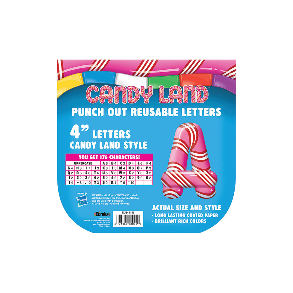 Try Eureka Reusable Punch Out Letters. Printed on coated paper with brilliant rich color, they are perfect for creating personalized projects in displays. Each letter measures at 4". Punch-out, reusable. Long lasting coated paper. Brilliant rich colors, fun and decorative. Character quantities vary by item.