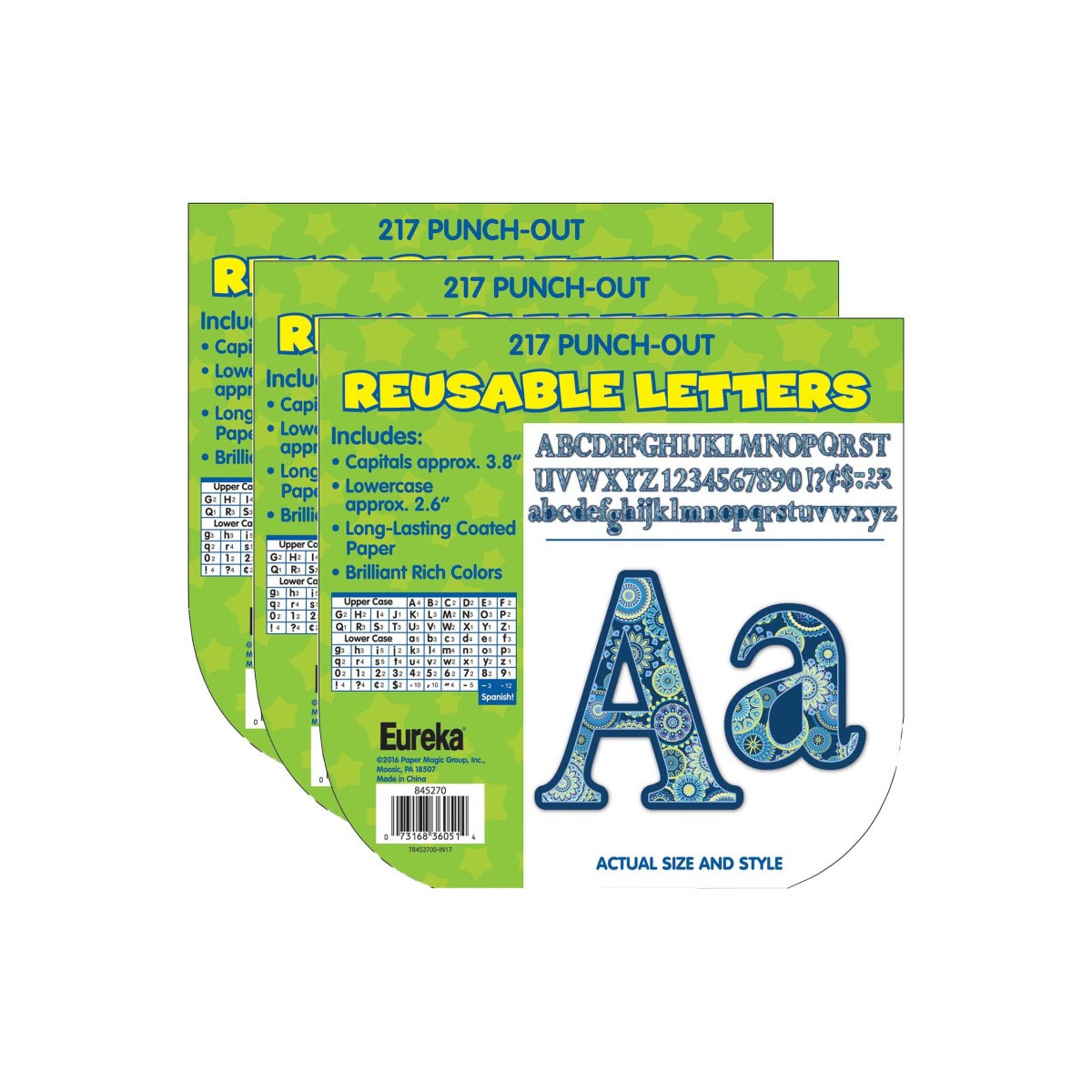 An easy way to create personalized classroom messages on bulletin boards, windows, chalkboards and hallways. Individual capital letters measure 3.8" and lowercase measure 2.6". Printed on long-lasting coated paper. Coordinates with the Blue Harmony collection. Each set includes 217 characters. Sold as 3 packs for a total of 651 characters.