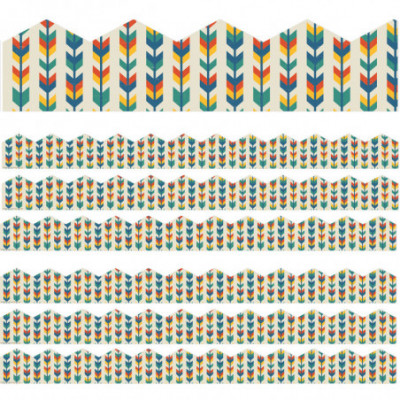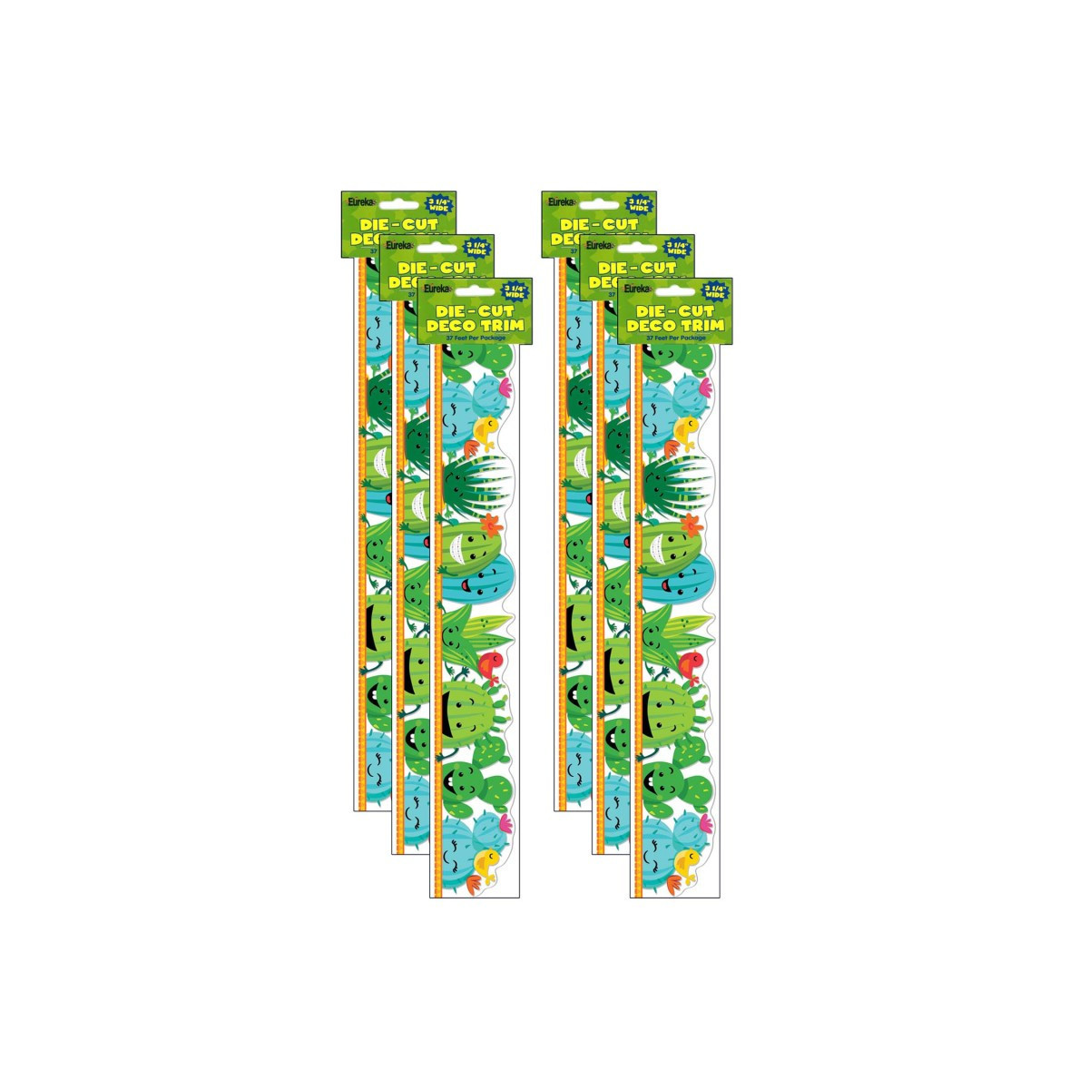 Use Eureka School Extra Wide Deco Trim to add a finishing border to your displays, windows, doorways or chalkboards. Vibrant colors plus a variety of styles and themes can add creativity to displays, windows, chalkboards and more. A Sharp Bunch Line-Up Extra Wide Die Cut Deco Trim measures 3.25" wide, and each package contains 12 strips (each 37" long) for a total of 37 feet. Full color illustration printed on card stock. Fun die-cut edge detailing. Coordinates with the Sharp Bunch Collection. Sold as a set of 6 packs, 72 strips (222 feet) total.