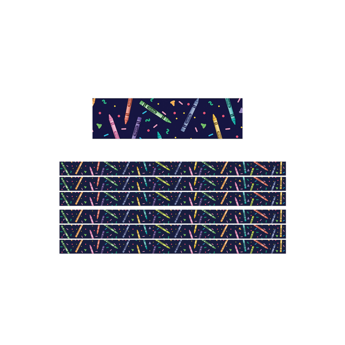 Use Eureka School Deco Trim® to add a finishing border to your displays, windows, doorways or chalkboards. Vibrant colors plus a variety of styles and themes can add creativity to displays, windows, chalkboards and more. Deco Trim® is printed on heavy weight cardstock and is reusable. Help amplify your students' learning environment with the easily recognizable look of Crayola®. Each pack includes 12 strips (each measuring 2-1/4" x 37") for a total of 37 feet. Sold as 6 packs for a total of 72 strips (324 feet).