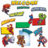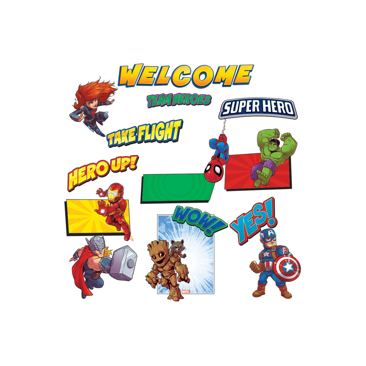 Set includes: 5 Blank Frames, 7 Marvel™ character cut outs, 7 deco letters that spell Welcome, and 6 super hero phrases. Packaged as 4 17" x 24" panels.