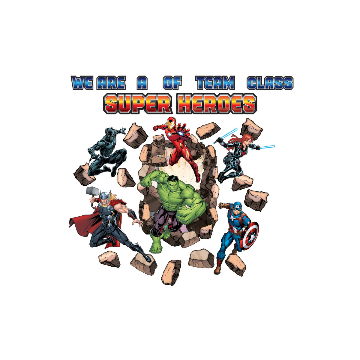 Set includes: 1 Rock Blast, 12 rock cut outs, 6 Marvel™ character cut outs, and a 7 piece We Are A Class Team of Super Heroes header. Packaged as 4 17" x 24" panels.