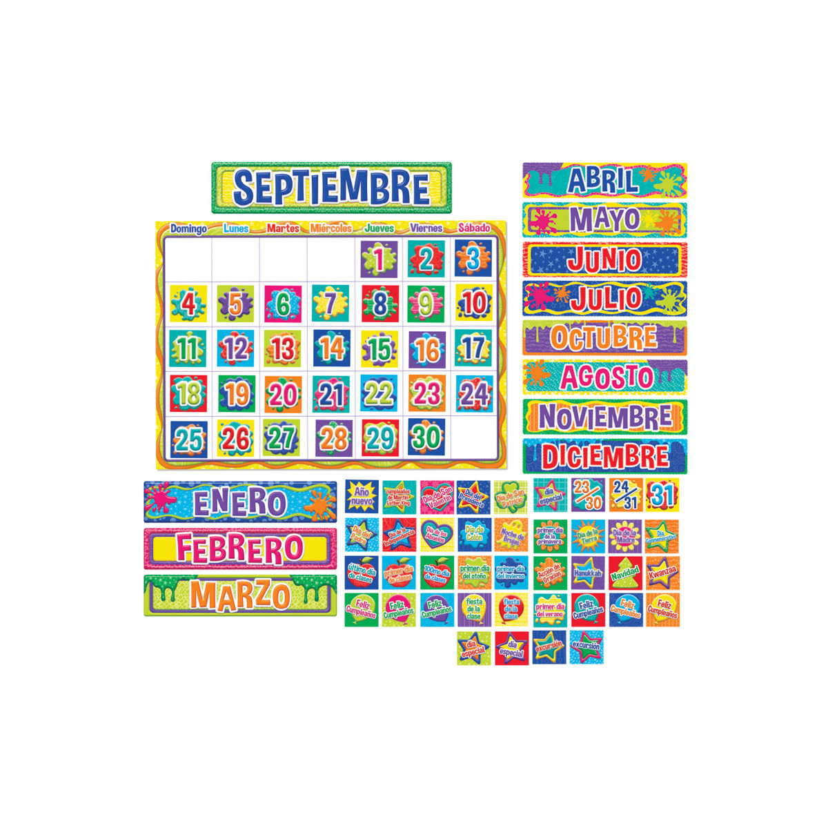 Teach your students the days of the week and month in Spanish! Each 83 piece set includes: 1 Giant Calendar (34"x24"), 12 Month Headings, 33 Dates, 37 Special Day markers. Packaged as (4) 17" x 24" panels. Coordinates with the Color My World collection.