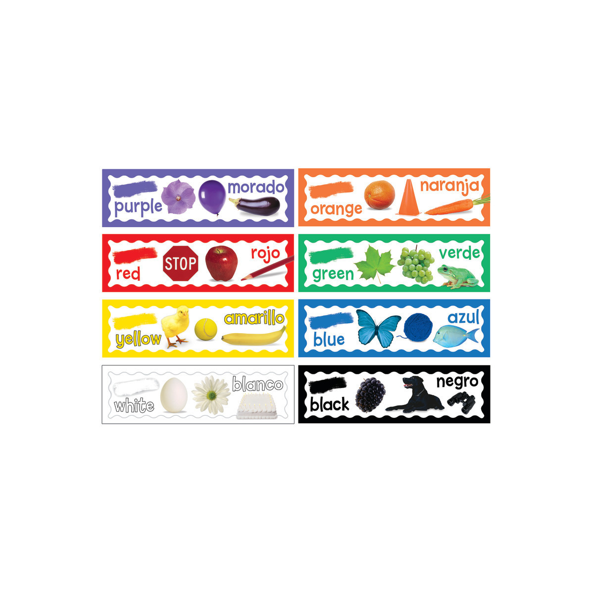 Each set contains 8 panels packaged in a polybag with a header. Total package size is 6.5" wide x 26" long. Includes: 8 Bilingual Spanish Panels