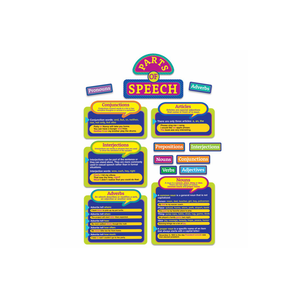 Teach your students about the different parts of speech with a 22 piece Eureka Bulletin Board Set. Each 22-piece set is packaged as 6 panels including: 9 Parts of Speech Die-Cut Signs, 3 Piece Header, 9 Mini Signs, and 1 Teacher's Resource Guide.