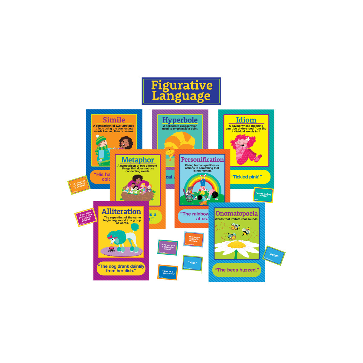 Eureka Bulletin Board Sets are an excellent resource for students and help to reinforce daily lessons. Each set includes 7 Colorful Mini Posters (each measuring 12" x 17") illustrating seven types of figurative language (Simile, Metaphor, Idiom, Hyperbole, Alliteration, Onomatopoeia and Personification), a Teacher Guide and 8 mini signs with additional example phrases.