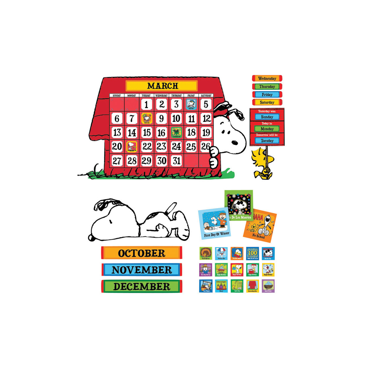 Eureka Bulletin Board Sets are sure to bring any room to life. With the brightest colors, individual designs and variety of styles, the choices are endless. Everything needed to create a giant classroom calendar, with month headings, dates and additional squares containing illustrations that highlight special days. The Peanuts gang can be part of your classroom with this fun calendar set that incorporates two different Snoopy poses. 112 Piece Set Includes 1 Giant Calendar (34" x 24").