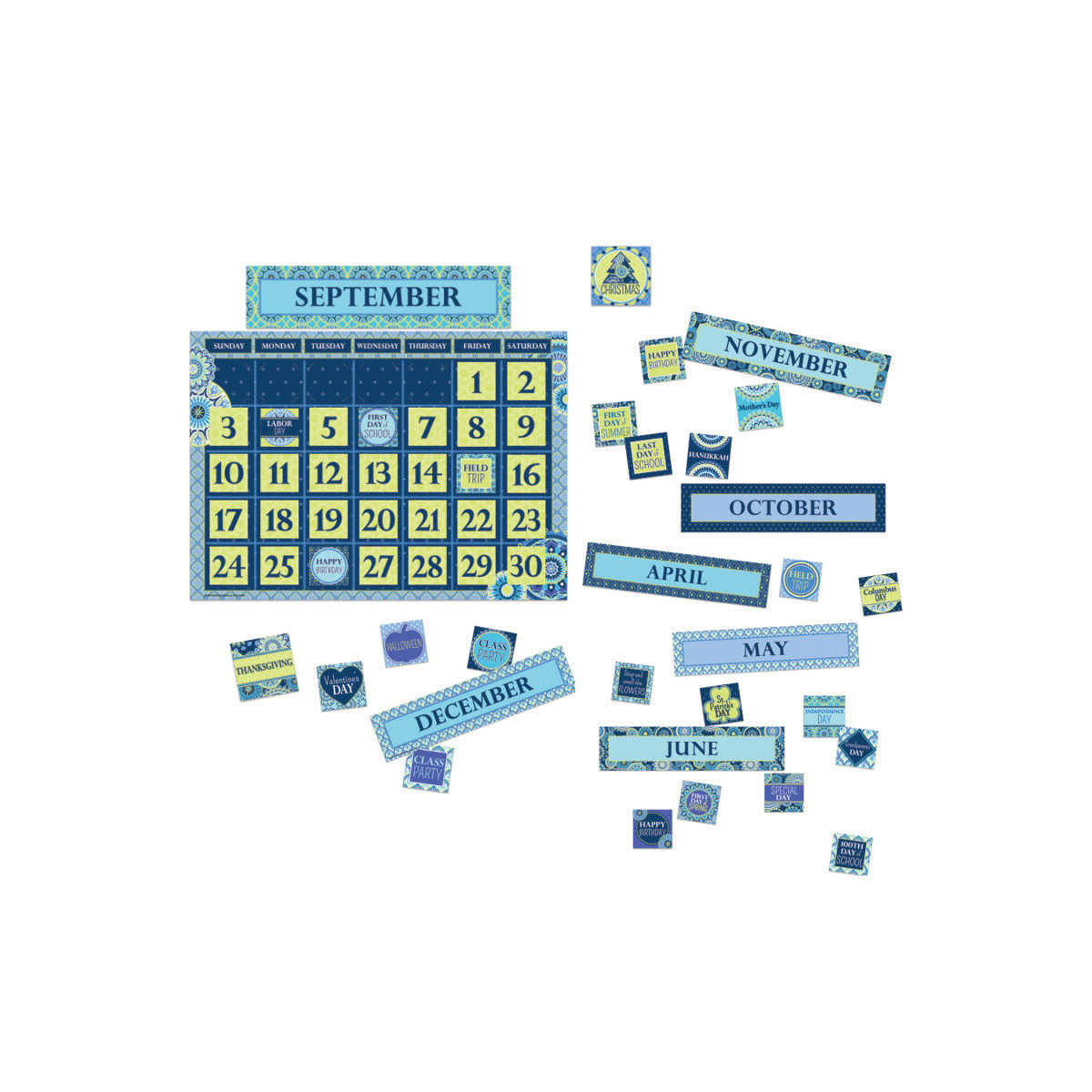 Teach and keep track of the days of the week and month with a 85 piece bulletin board set. Set includes 1 Giant Calendar (17" x 24"), 12 Month Headings, 33 Dates and 37 Special Days. Packaged as four 17" x 24" panels. Coordinates with the Blue Harmony collection.