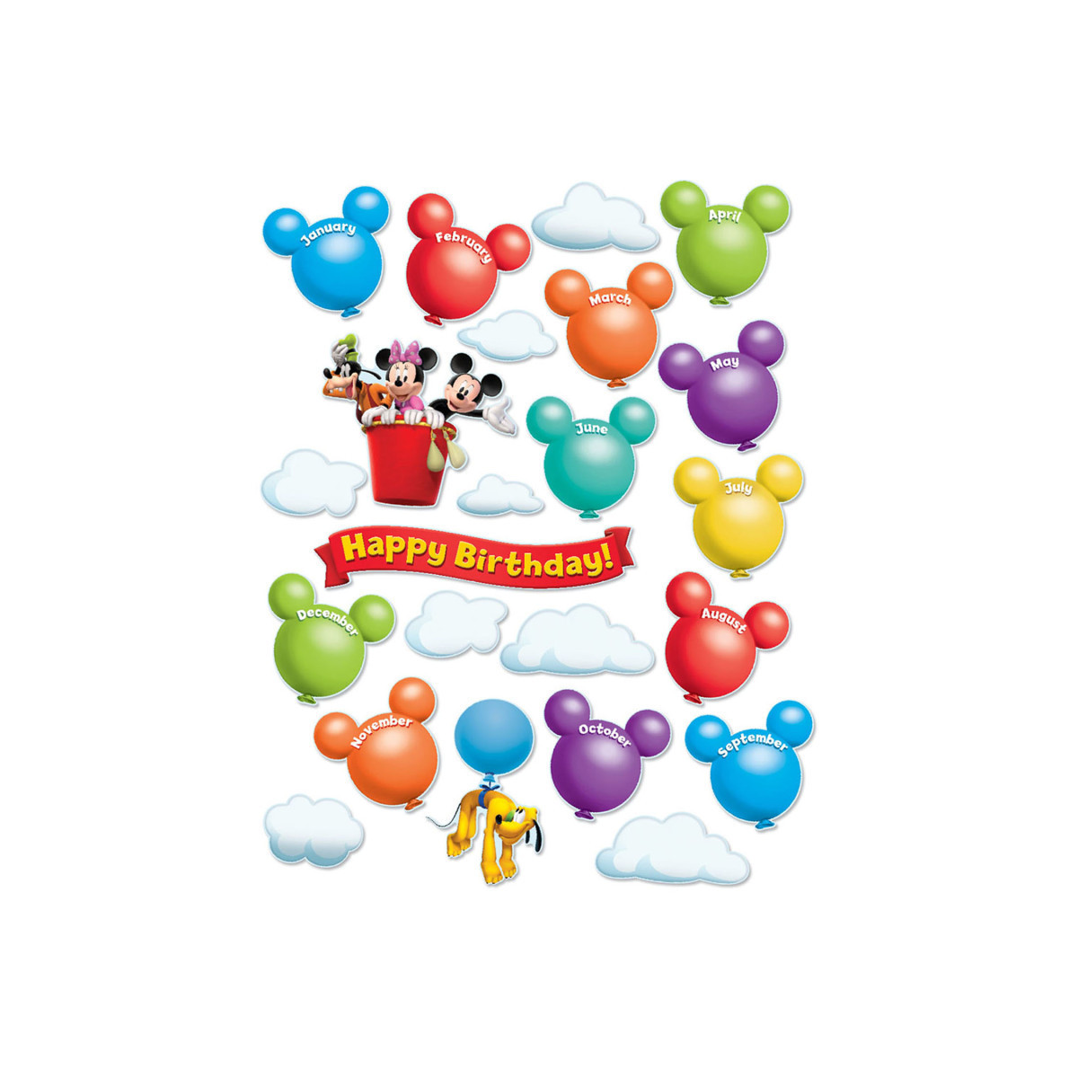 Eureka Bulletin Board Sets are sure to bring any room to life. With the brightest colors, individual designs and variety of styles, the choices are endless. This 24 piece set includes: 6 panels with 12 Month Mickey heads, 2 Characters, 9 Clouds and 1 "Happy Birthday" Banner.
