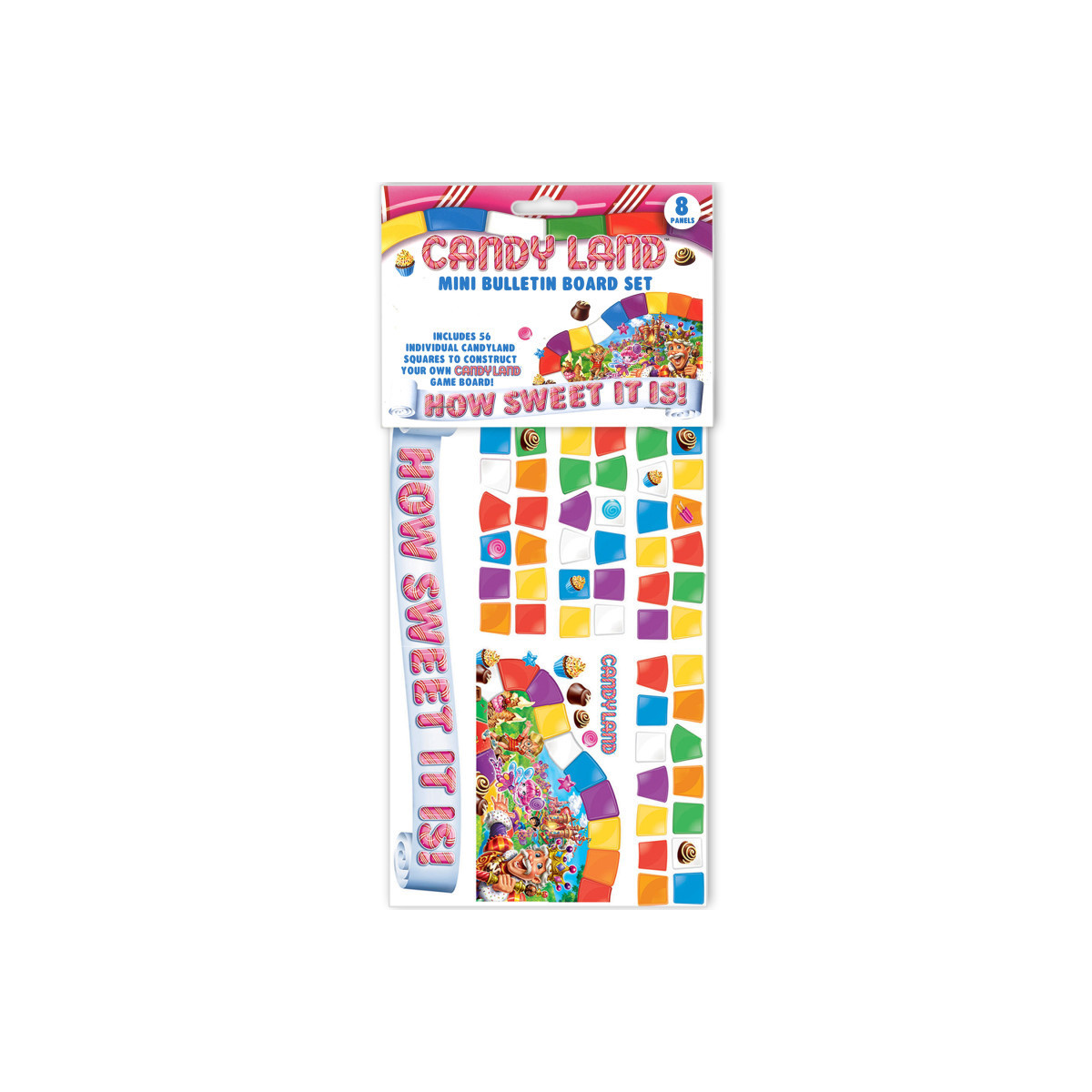 8 Panel Set Includes: 1 double die-cut panel of King Kandy with Candy Castle background (21" x 12" when assembled), 1 double die-cut panel of "How Sweet It Is" banner (41" x 6" when assembled), 56 game squares, 4 candy pieces and 1 Candy Land™ logo