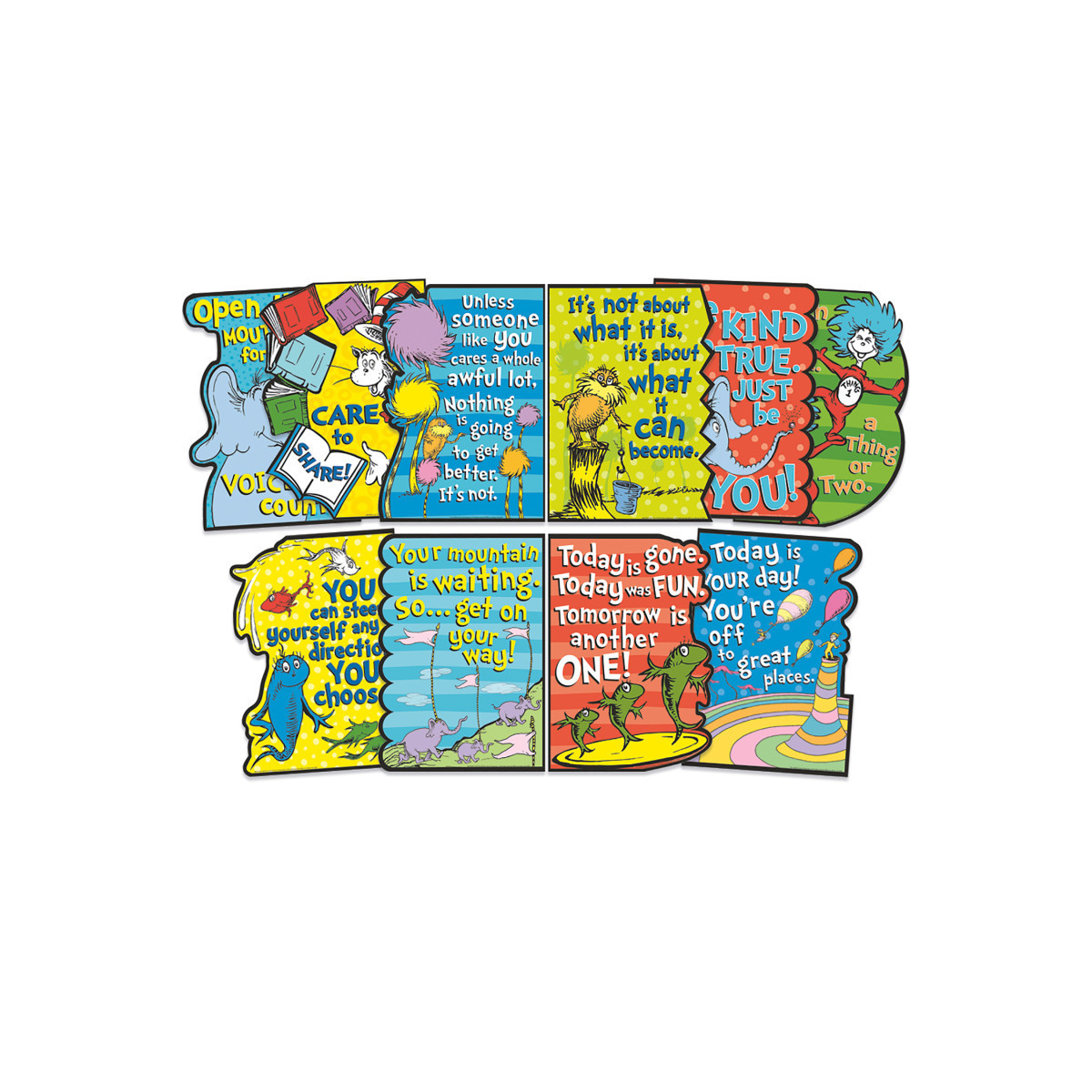 Eureka Bulletin Board Sets are a great way to add creativity to bulletin boards, hallways, walls and classroom space with fun designs and themes. Each 10-piece set includes 5 panels with: 10 die-cut posters with motivational phrases from your favorite Dr. Seuss books & characters! Each poster measures 17" x 12". Full color illustrations printed on heavy weight card stock. Reusable. Coordinates with Dr. Seuss™ collections.
