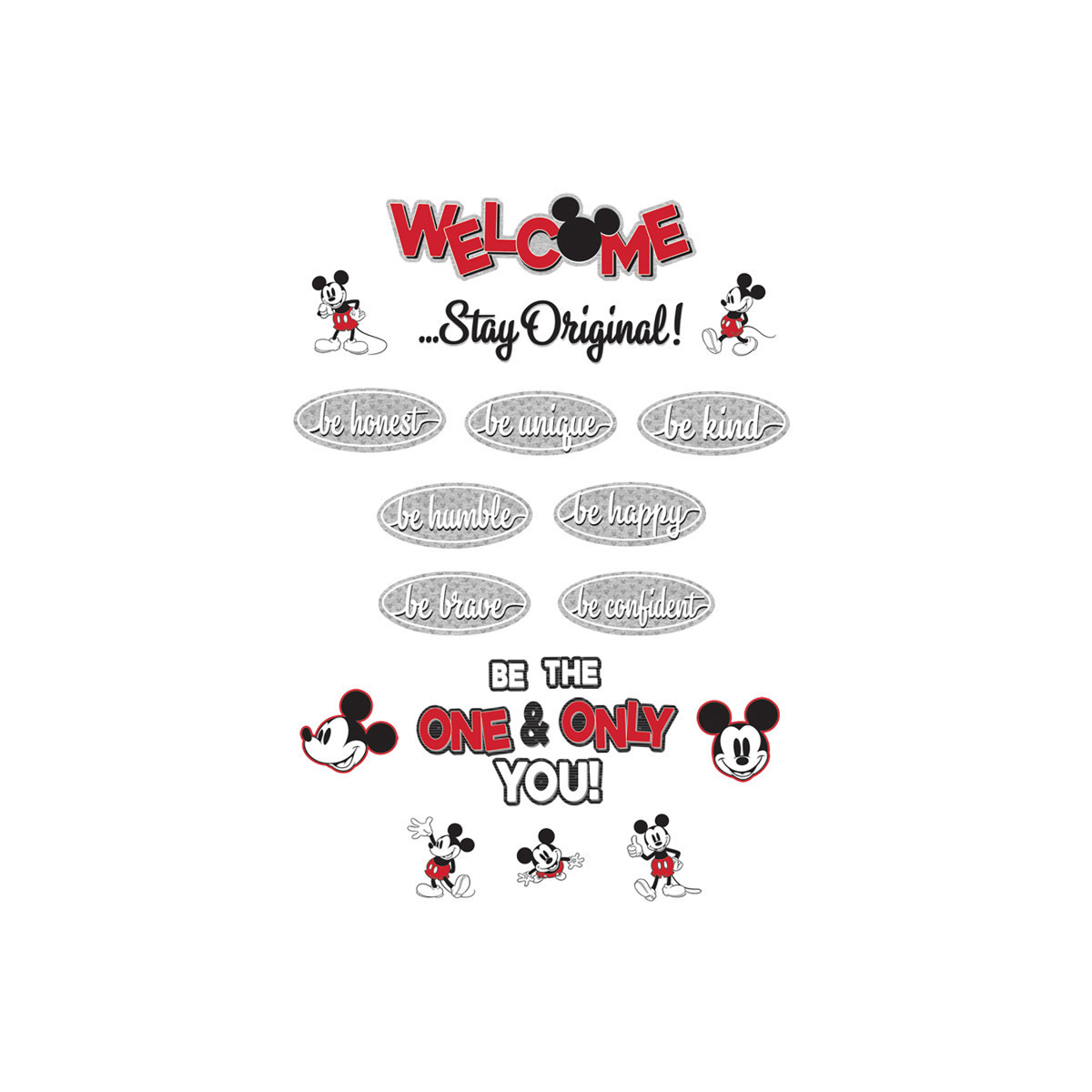 Teach and encourage positive behaviors and responsibility in your classroom with a Eureka Mini Bulletin Board Set. Each set includes 22 pieces: 1 Welcome Sign, 1 Stay Original Sign, 7 Ways to Stay Original, 7 Mickey Poses, and a 6 piece die-cut phrase that spells out "Be the One & Only You!"