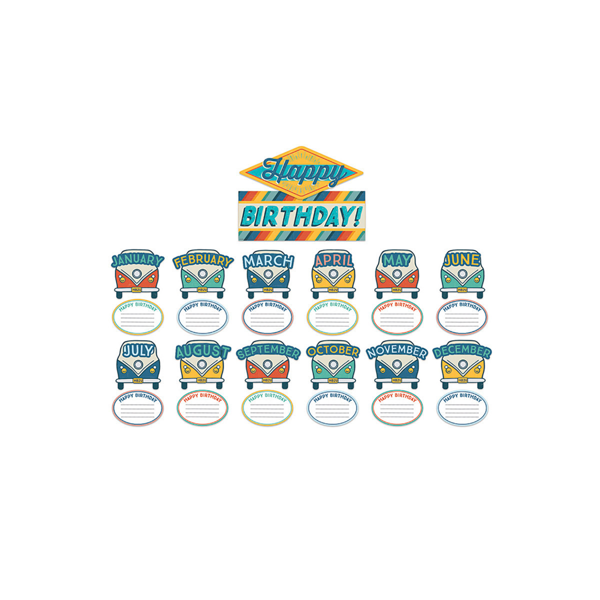 Celebrate your students birthday in style with a 27 Piece Eureka Birthday Mini Bulletin Board Set. Each set includes 37 pieces packaged as 8 panels: 1 Happy Birthday Header (2 pieces), 12 Month Headers, and 13 Name Plates, each with space for 4 names.