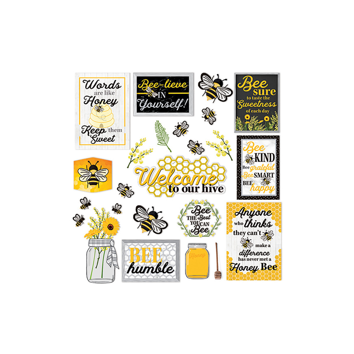 Eureka Bulletin Board Sets are a great way to add creativity to bulletin boards, hallways, walls and classroom space with fun designs and themes. Each set includes 34 pieces packaged as 4 panels: 1 Welcome Header, 6 Motivational Posters, 9 Flying Bees, 3 Honeycomb Accent Pieces, and 15 Various Die-Cut Pieces.