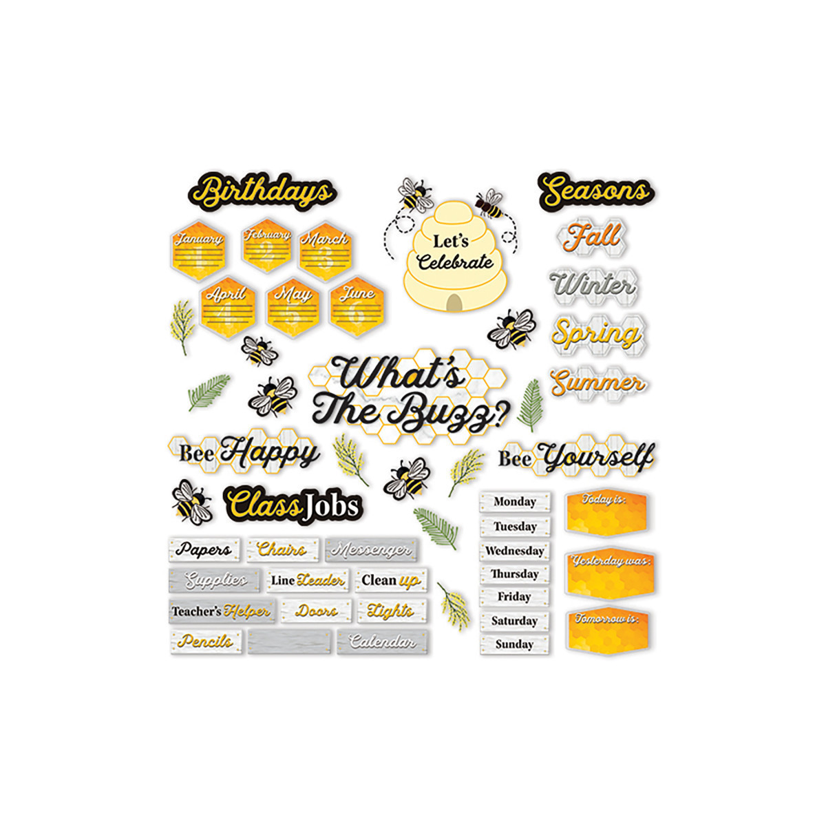 Eureka Bulletin Board Sets are a great way to add creativity to bulletin boards, hallways, walls and classroom space with fun designs and themes. Each set includes 63 pieces packaged as 5 panels: "Let's Celebrate" Header (1 Piece), "What's The Buzz?" Header (1 Piece), Class Jobs with Header (15 Pieces), Days of the Week with Indicators (10 Pieces), Birthday Header with Months (13 Pieces), Seasons of the Year with Header (5 Pieces), Various Die-Cut Pieces and Headers (18 Pieces).