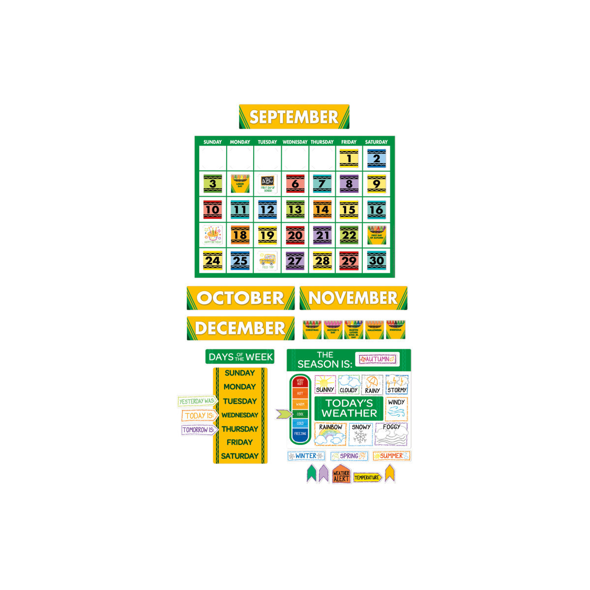Eureka Bulletin Board Sets are a great way to add creativity to bulletin boards, hallways, walls and classroom space with fun designs and themes. Each 99 piece set includes 5 panels with: 1 giant calendar, 12 month headings, 33 dates, 37 special days, 1 days of the week chart, and season and weather indicators.