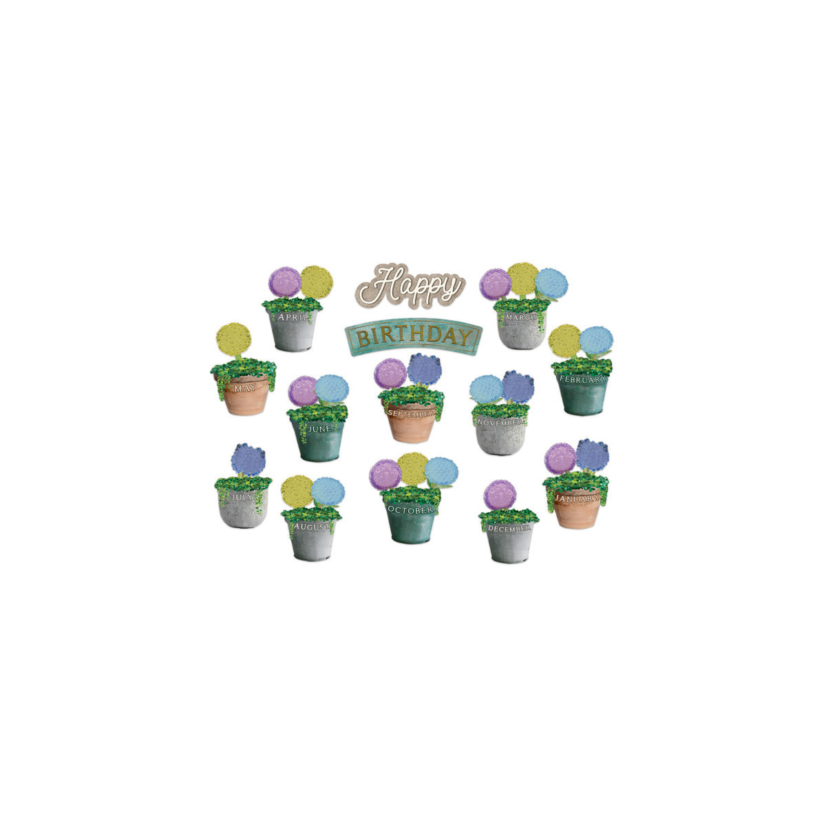 Celebrate your students' birthdays with a 48 piece Eureka Mini Bulletin Board Set. Each set includes 8 panels with: 2-piece Happy Birthday header, 34 blank flowers, and 12 month pots. Full color illustration printed on card stock.