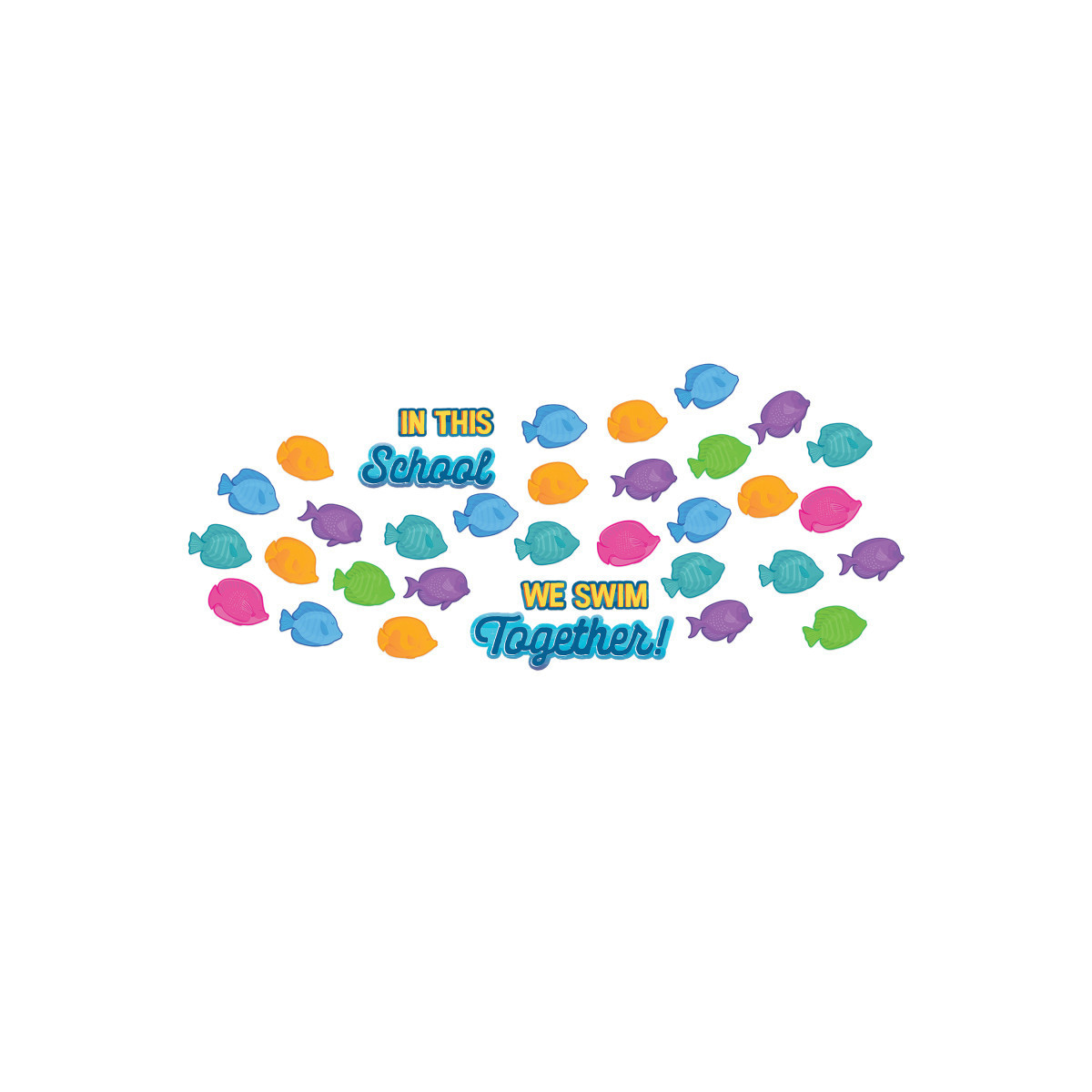 What's Included – 36-piece set includes 8 panels with: 6-piece "In This School We Swim Together" Header and 30 colorful fish.