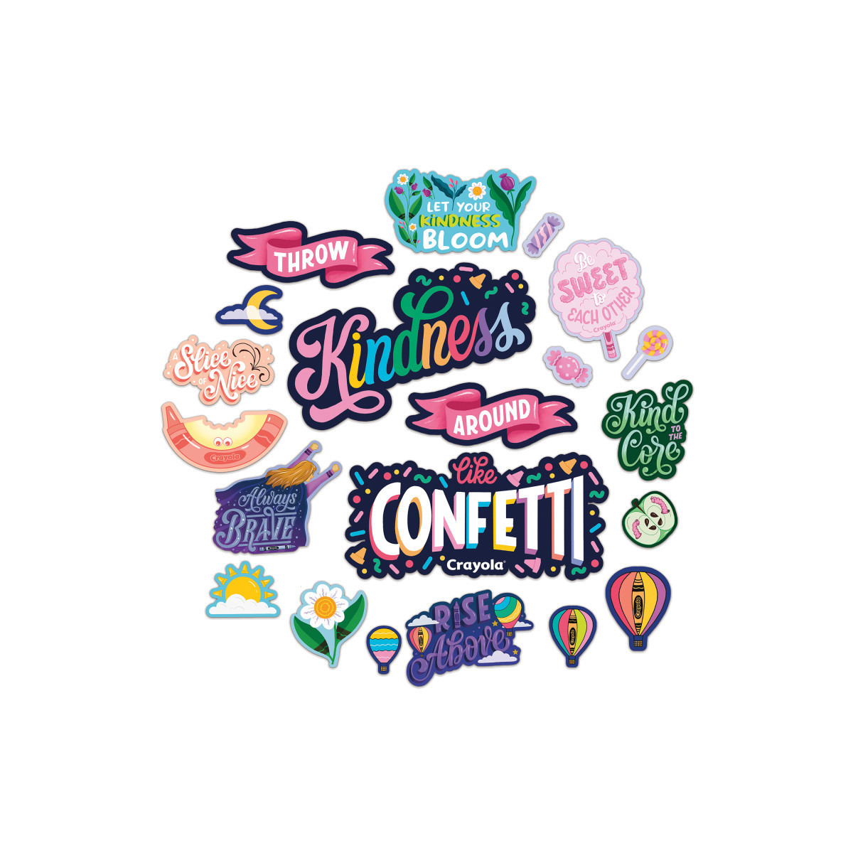 What's Included – 21-piece set includes 4 panels with: A 4-piece "Throw Kindness Around Like Confetti" header, 6 kind phrases, and 11 decorative-pieces.