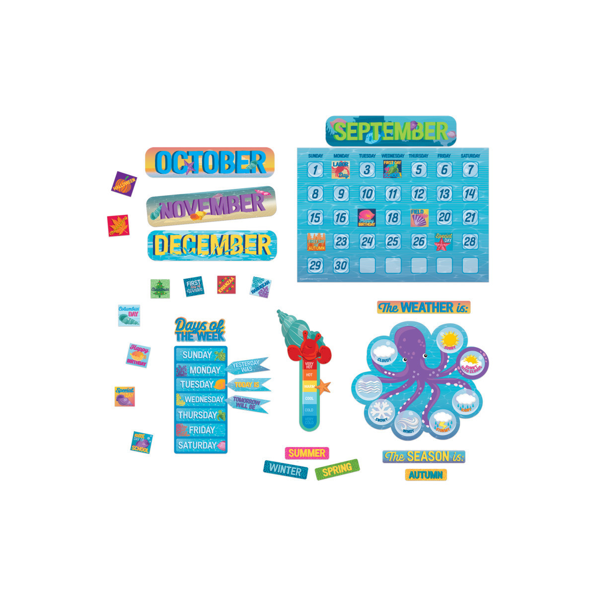 Teaching Tool – Use the Seas the Day calendar set to teach students about the days, months, seasons and more.