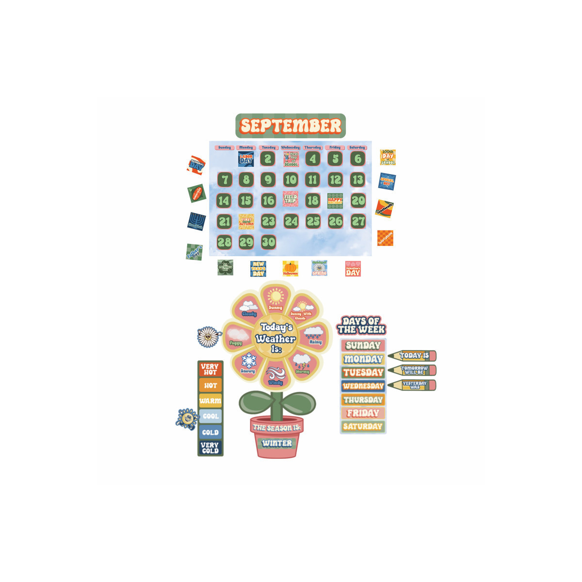 Teaching Tool – Use the S'Cool Era calendar set to teach students about the days, months, seasons and more.