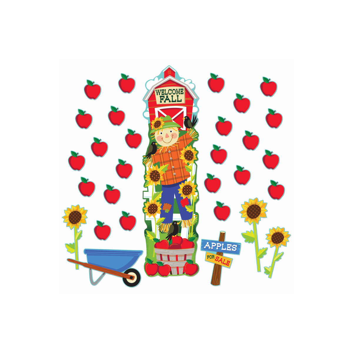30 Piece set includes 24 Paper Cut Outs, 5 Assorted Decorative Pieces, and 1 Die Cut 45" Banner With Foil.