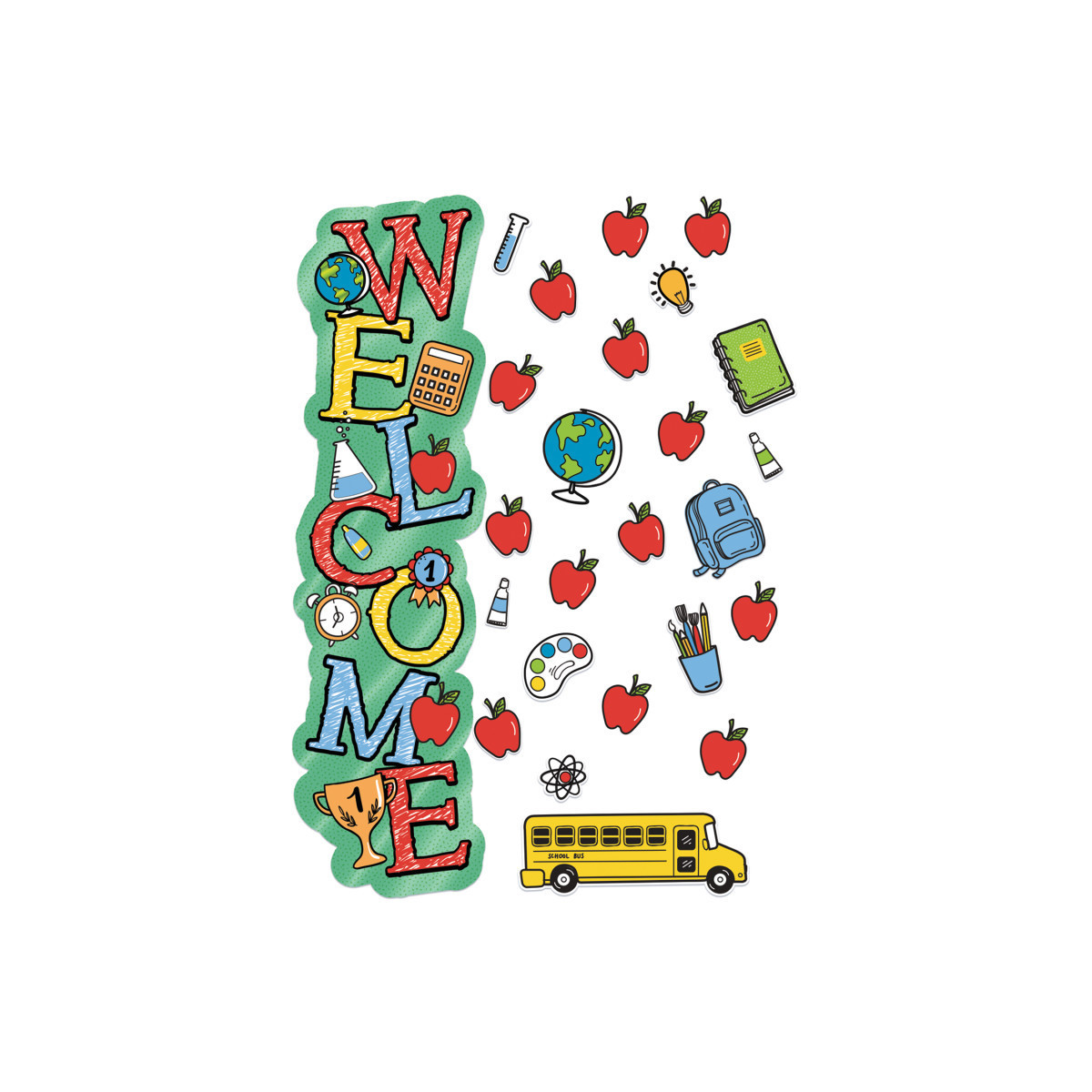 Create a warm welcome for your students and classroom visitors using Eureka School All-In-One Door Decor Kits! The 40 piece set includes 24 Paper Cut Outs, 15 Assorted Decorative Pieces, and 1 Die Cut 45" Banner With Foil. Packaged as (3) 17" x 24" panels.