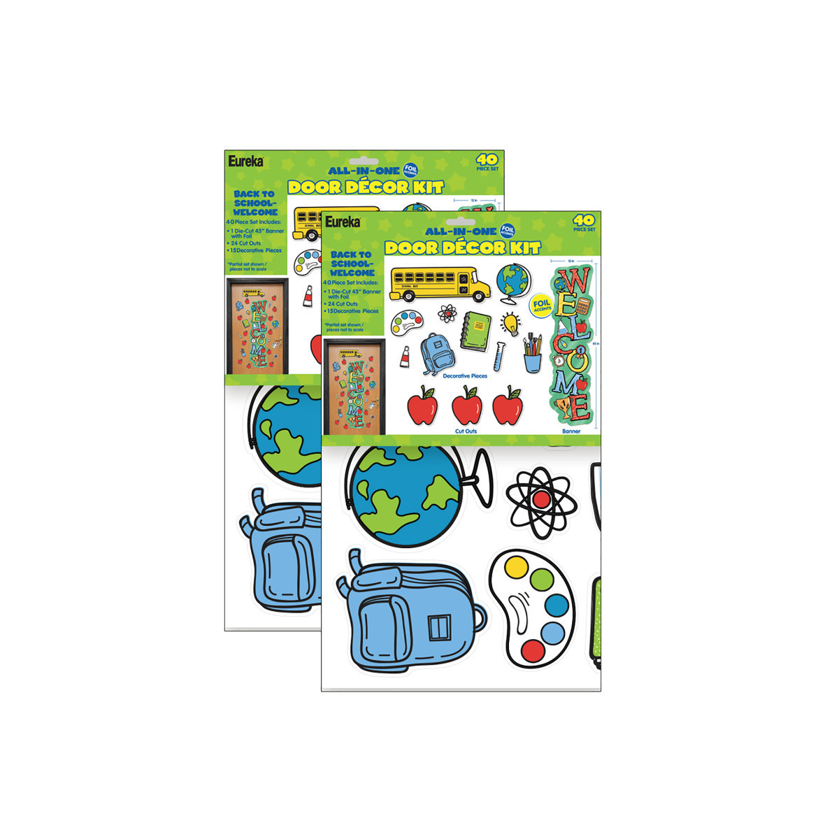 Create a warm welcome for your students and classroom visitors using Eureka School All-In-One Door Decor Kits! The 40 piece set includes 24 Paper Cut Outs, 15 Assorted Decorative Pieces, and 1 Die Cut 45" Banner With Foil. Packaged as (3) 17" x 24" panels. Sold as 2 kits.