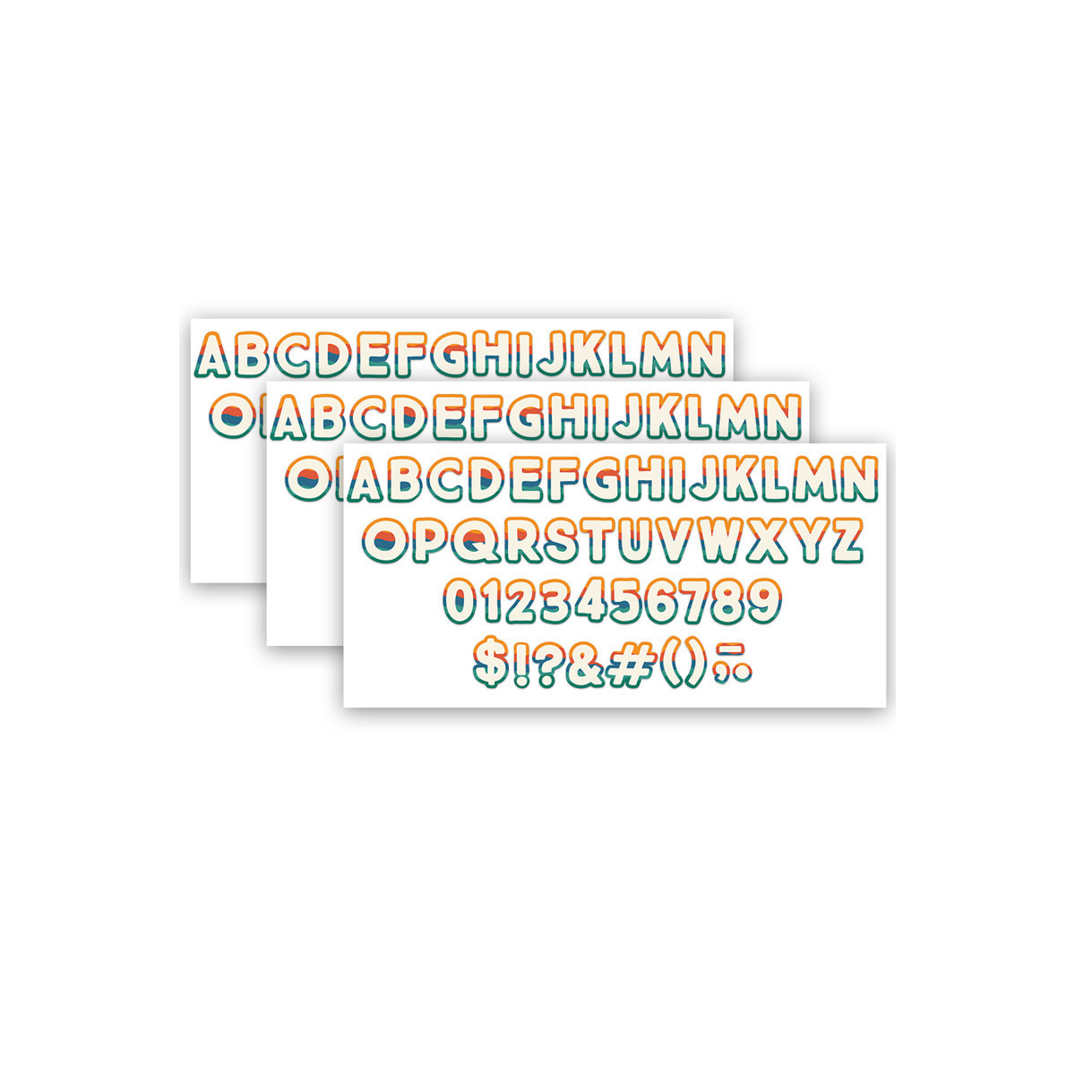 Try Eureka Reusable Punch Out Letters. Printed on coated paper with brilliant rich color, they are perfect for creating personalized projects in displays. Each punch-out, reusable letter measures 4", printed on long-lasting coated paper. Each pack includes 179 characters. Sold as 3 packs for a total of 537 characters