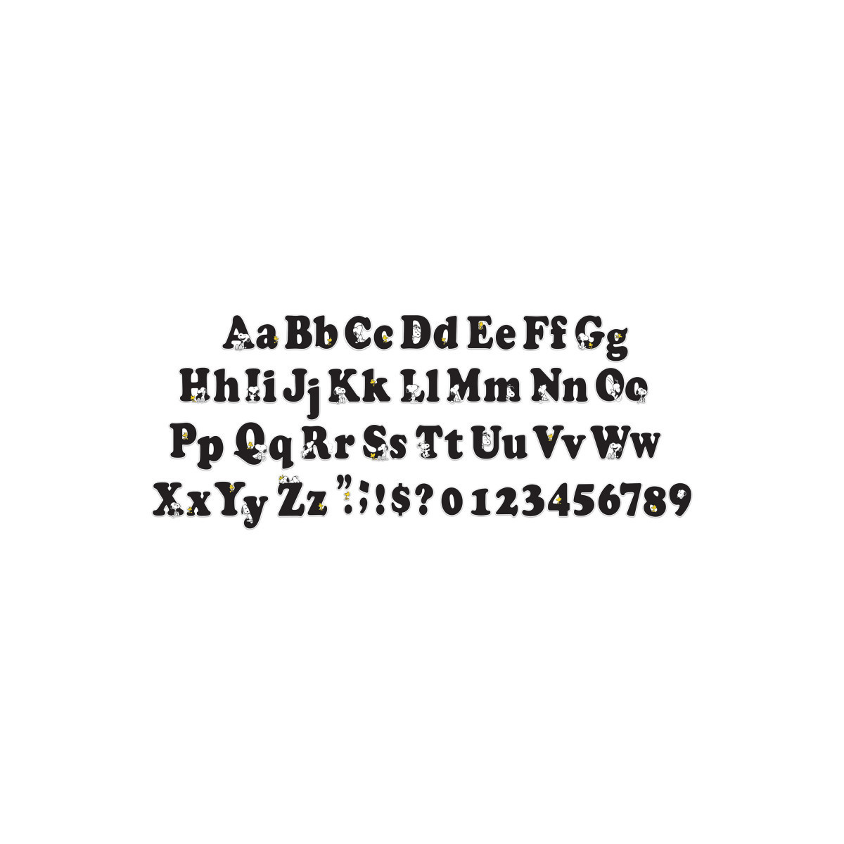 What's Included – Set includes 210 Peanuts-style letters, including uppercase letters, lowercase letters, numerals, punctuation marks, and symbols. Design element does not appear on every letter/number and varies in placement.