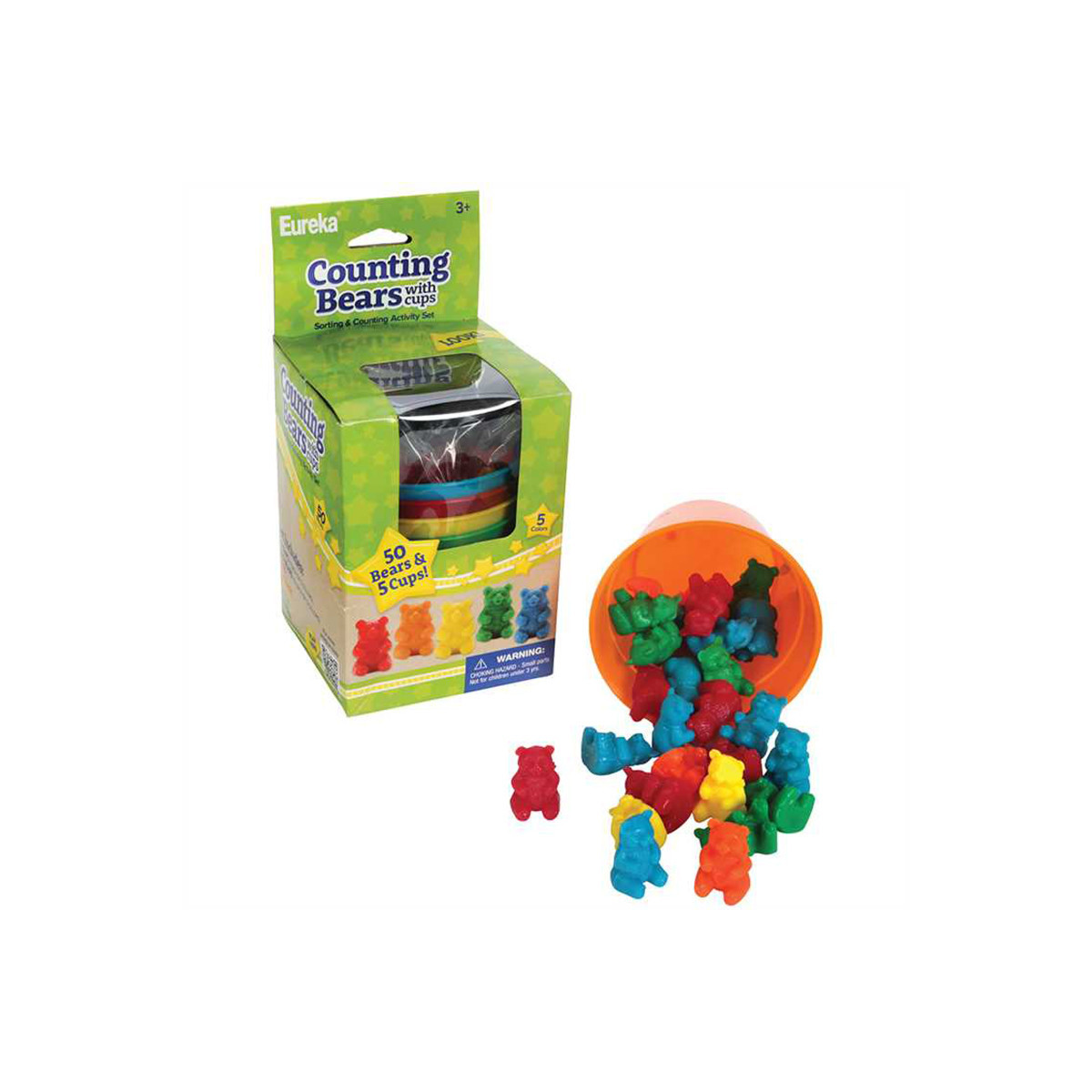 Eureka Manipulatives are great for teaching early childhood learning and a great tool in helping students recognize connections within each educational topic. Great for match prep! Plastic tub measures 3 3/4" x 5 1/2" x 3 3/4". Each set includes 50 plastic bears (10 each of five different colors) plus five cups in the colors that match the bears for extra sorting fun.