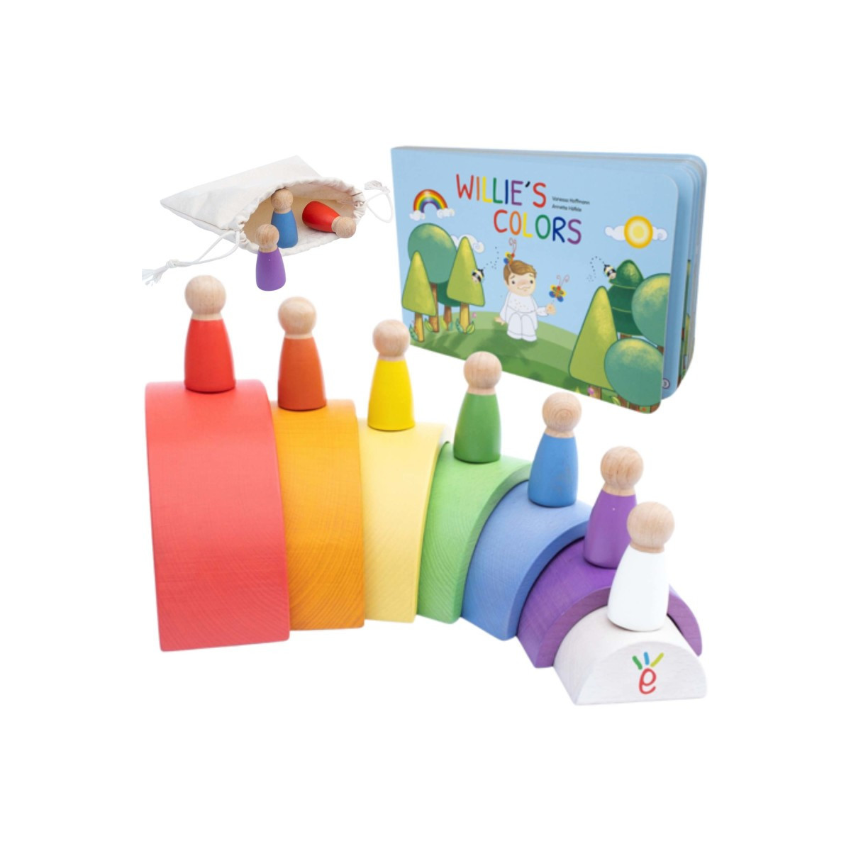 INSPIRES CREATIVITY AND EMOTIONAL INTELLIGENCE: The wooden rainbow stacking game offers endless ways of building with the blocks and peg dolls. The story of the educational book "Willie's colors" fosters playfully your kid's emotional intelligence!